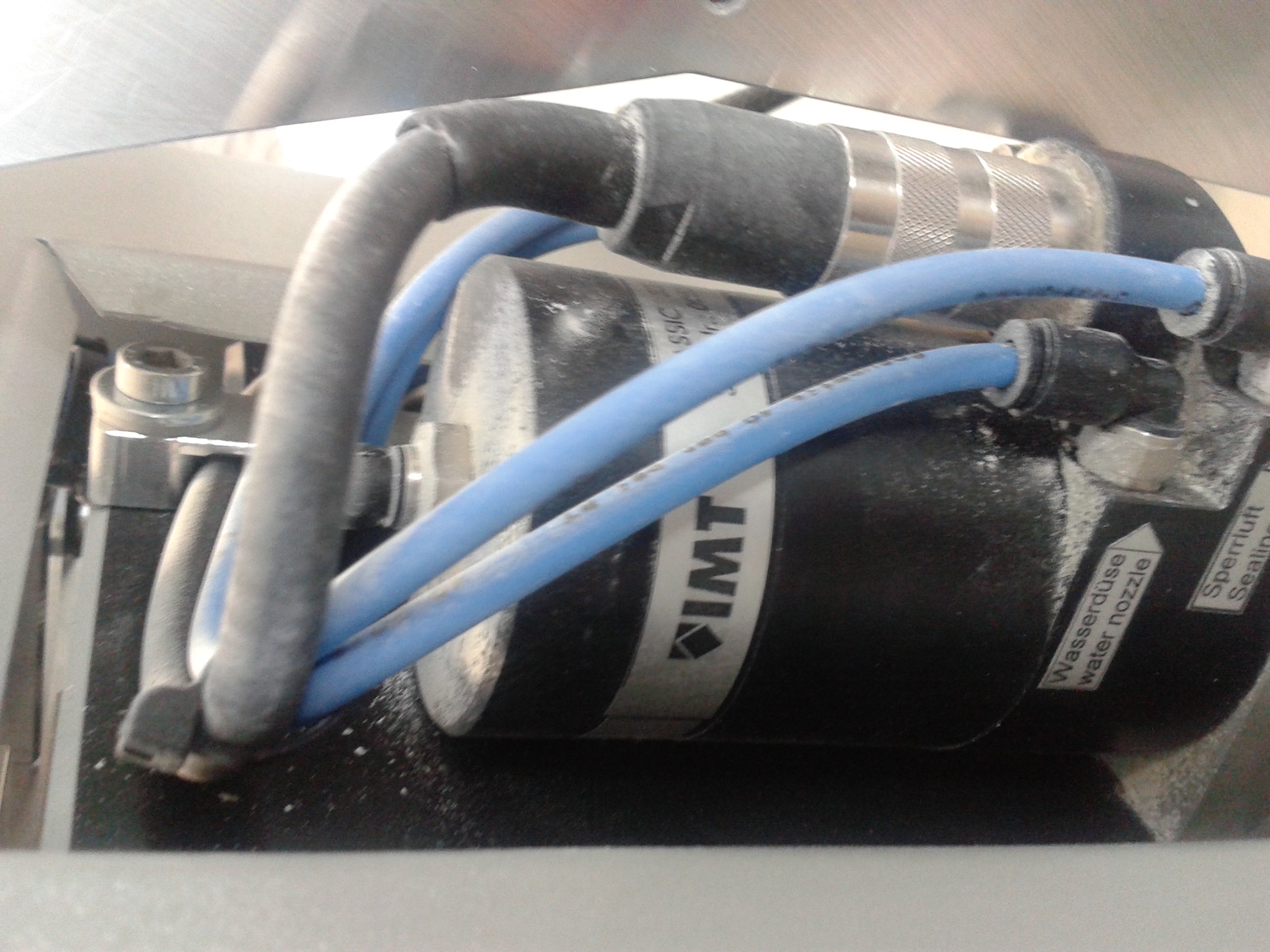 Так же и с моторами, расстояния минимизированы до предела, за счет этого не нужны дорогие сервы, хватает надежных шаговых, которые стоят на много дешевле. Теперь камера: Порскольку точат блоки прессованого оксида циркония - порошок лезет везде. В большом станке просто резинка на шпинделе, снизу никакой защиты. В маленьком - камера обработки полностью изолирована от остального пространства станка. Герметически закрывающаяся крышка, ось Х не на шптндель, а на заготовку идет. Ну и: