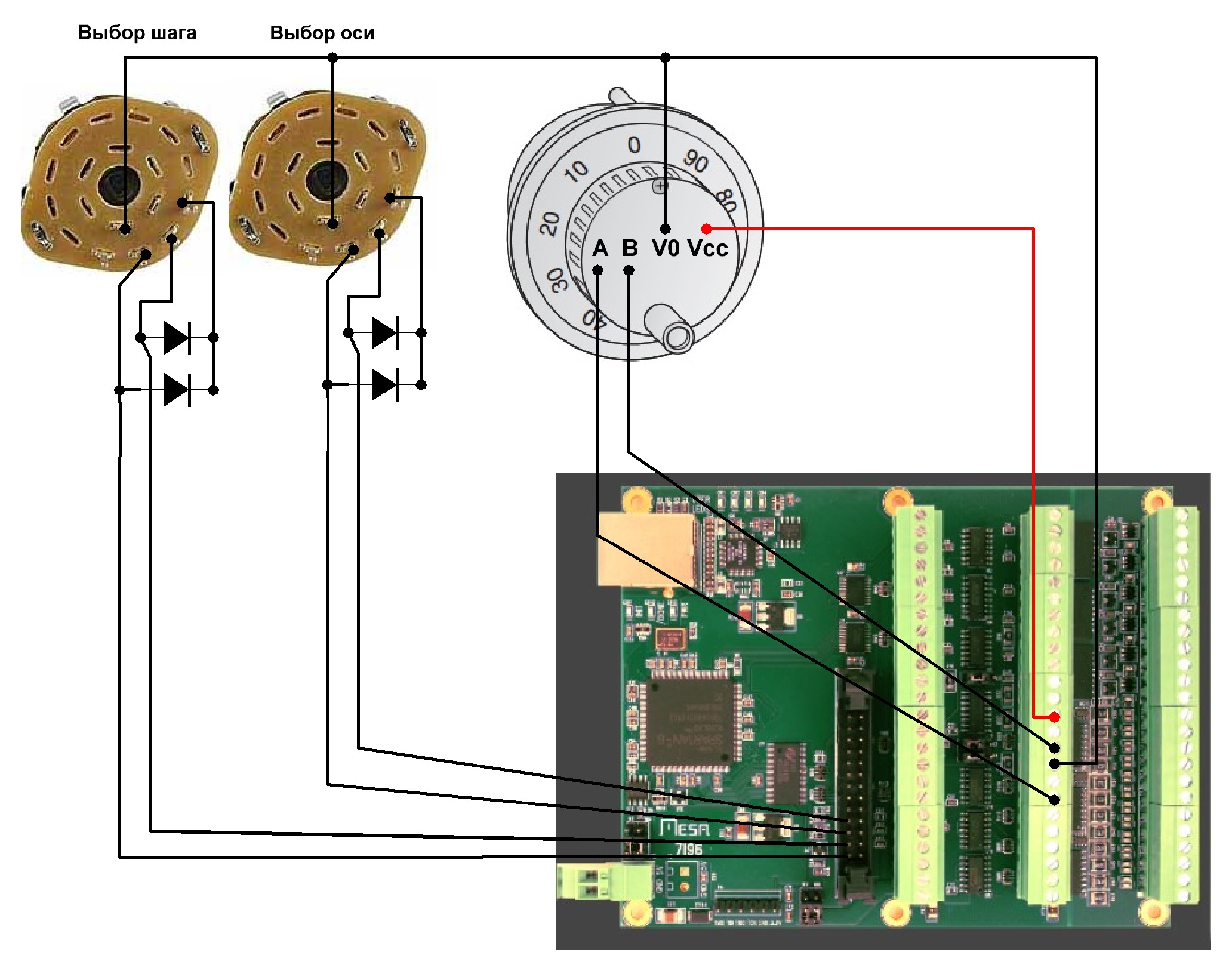Накидал схемку. Галетники использовал типа RS25, маховик на 100 импульсов, 5 вольт, 4 вывода.