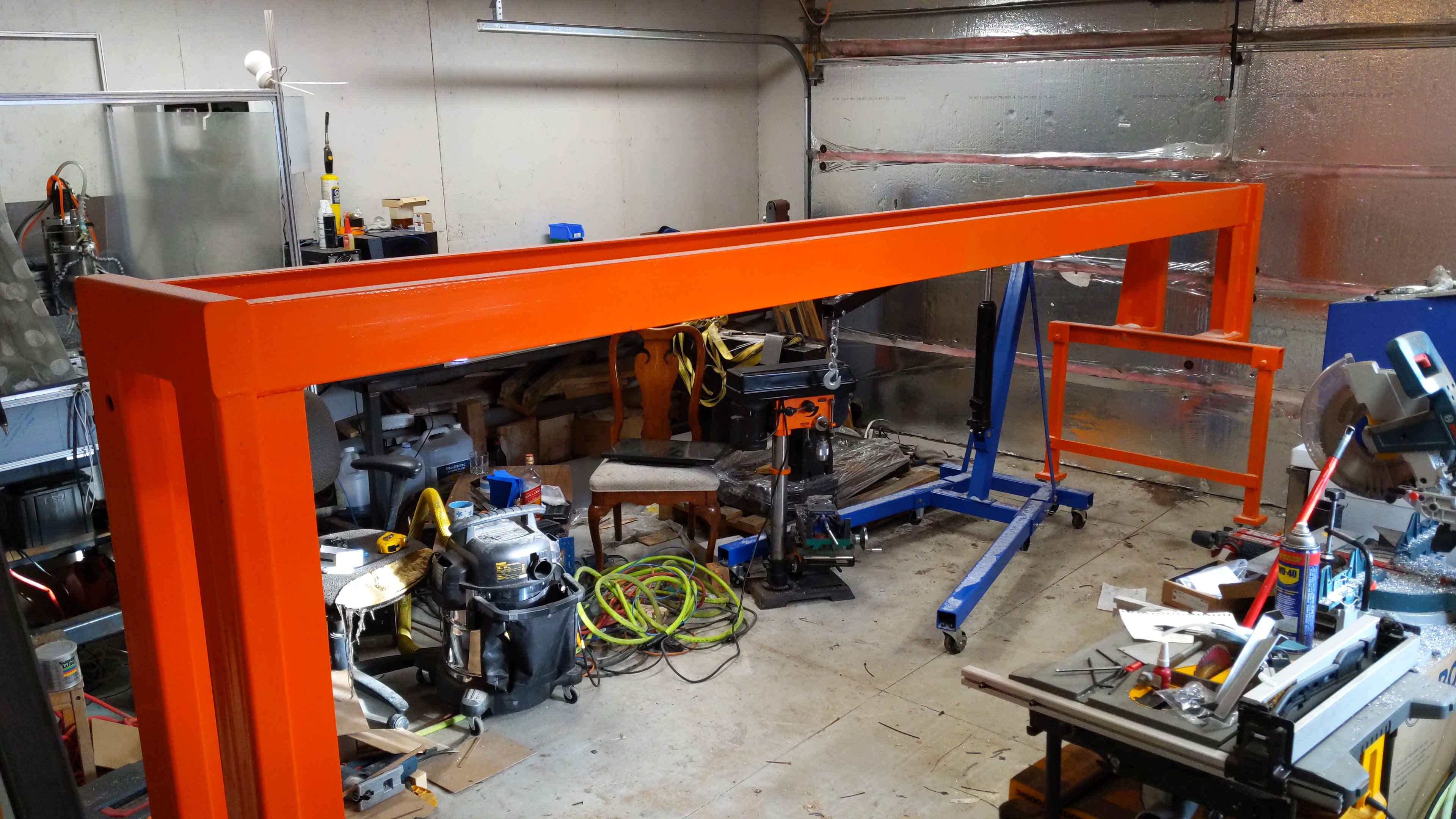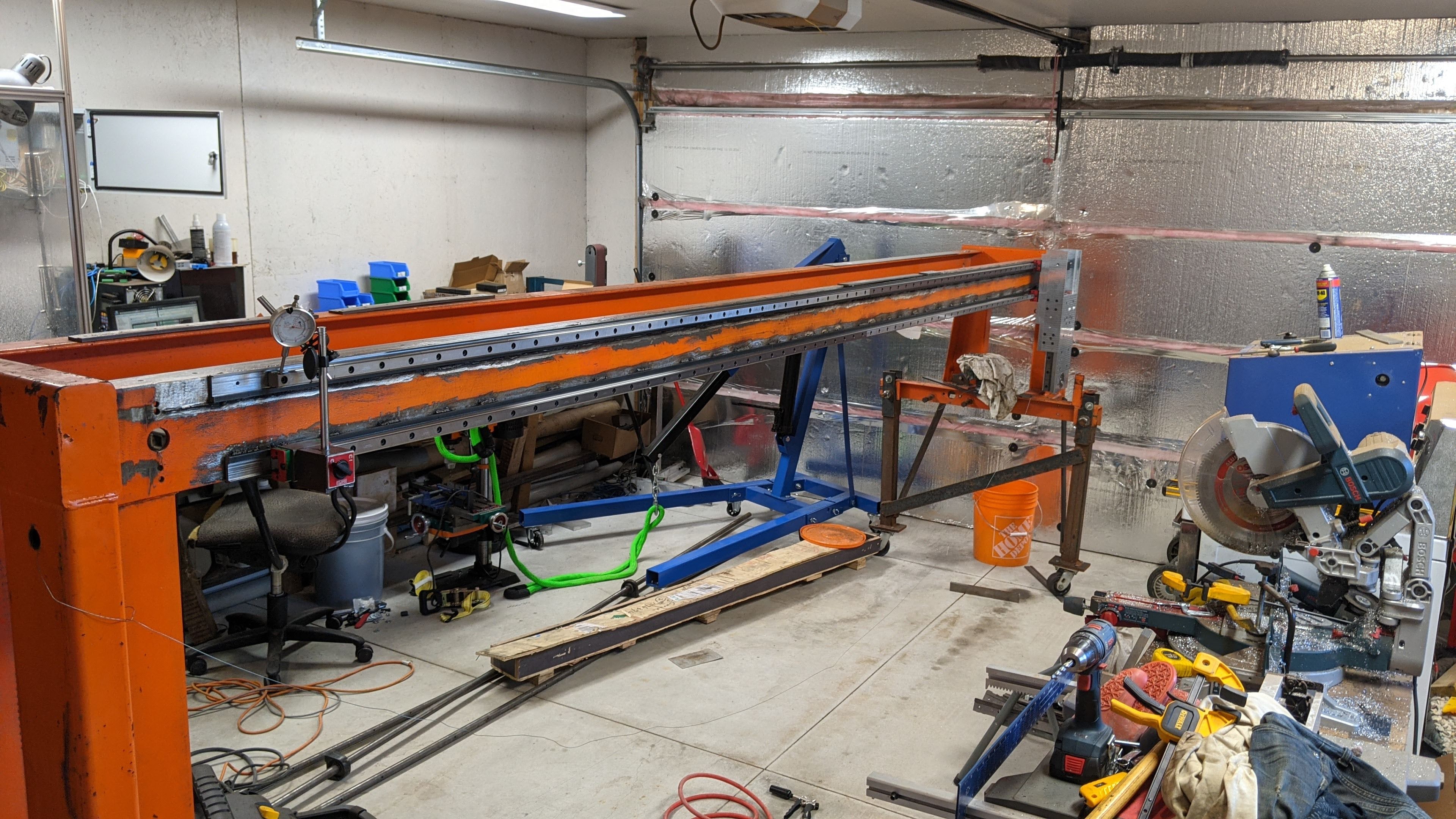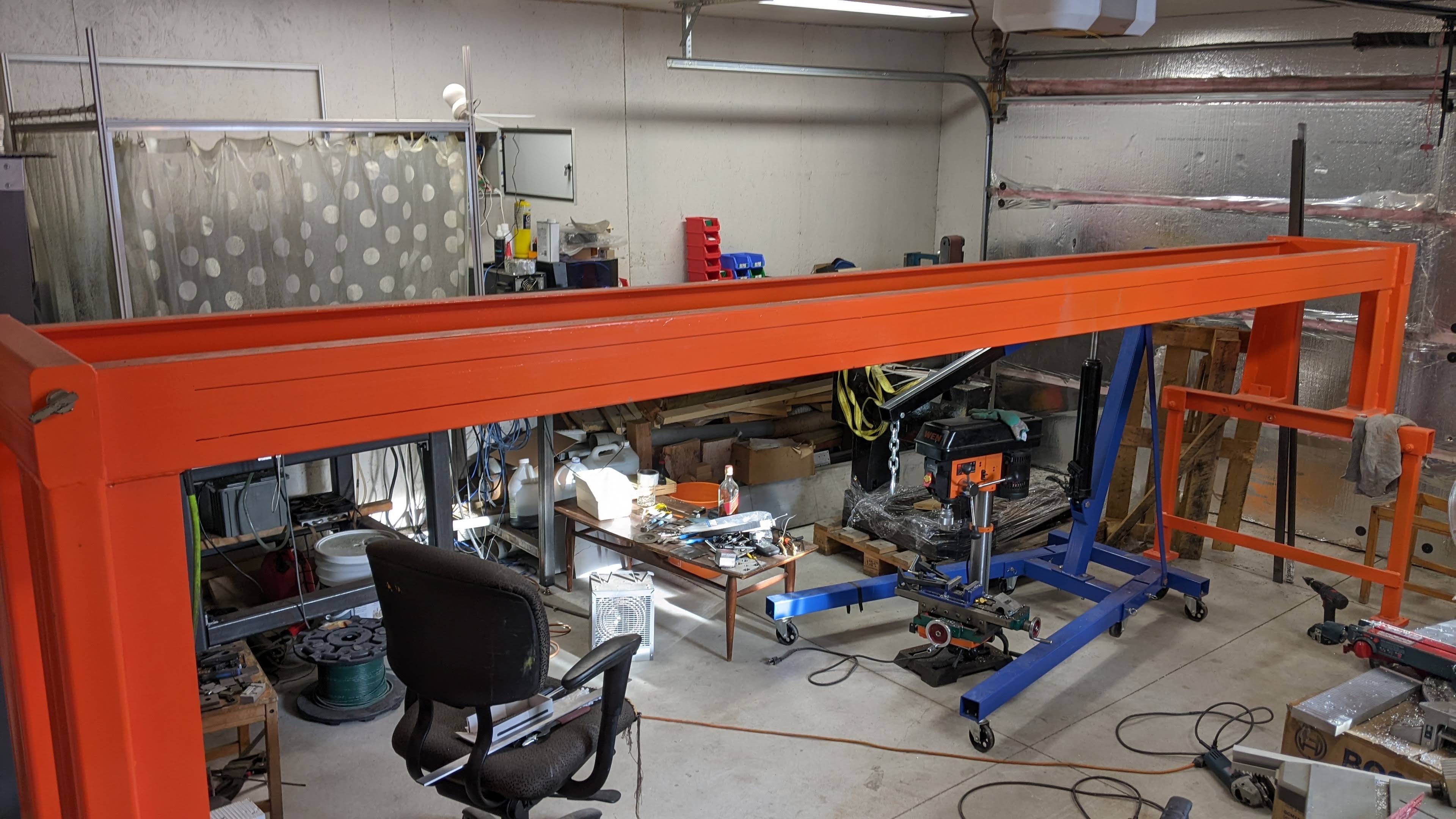 Приехал мост в одно зимнее утро: Так как к мосту были прекрепленны колеса то не составило труда закатить в гараж: Приступаем к навариванию проставок под рельсы: Ну и параллельно собираем шкаф управления: