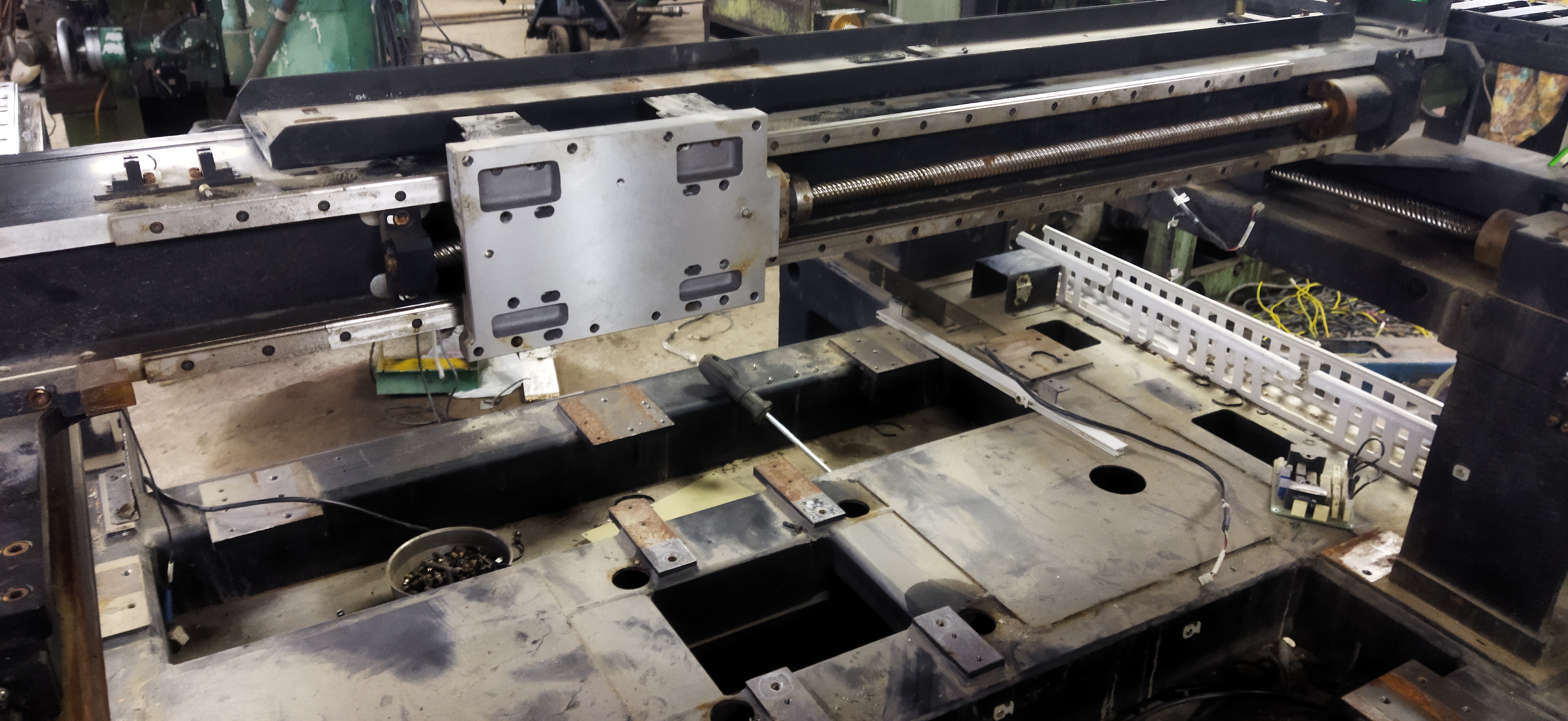 Габаритные размеры 1400х1400, масса около тонны. Основание сварное, довольно жёсткое, чугунные мостики на которых продольные направляющие и аллюминевая балка поперечина. Поле обработки можно вытянуть 1000 х700 примерно. На продольных стоят 25 рельсы ТНК и ШВП с одной стороны.