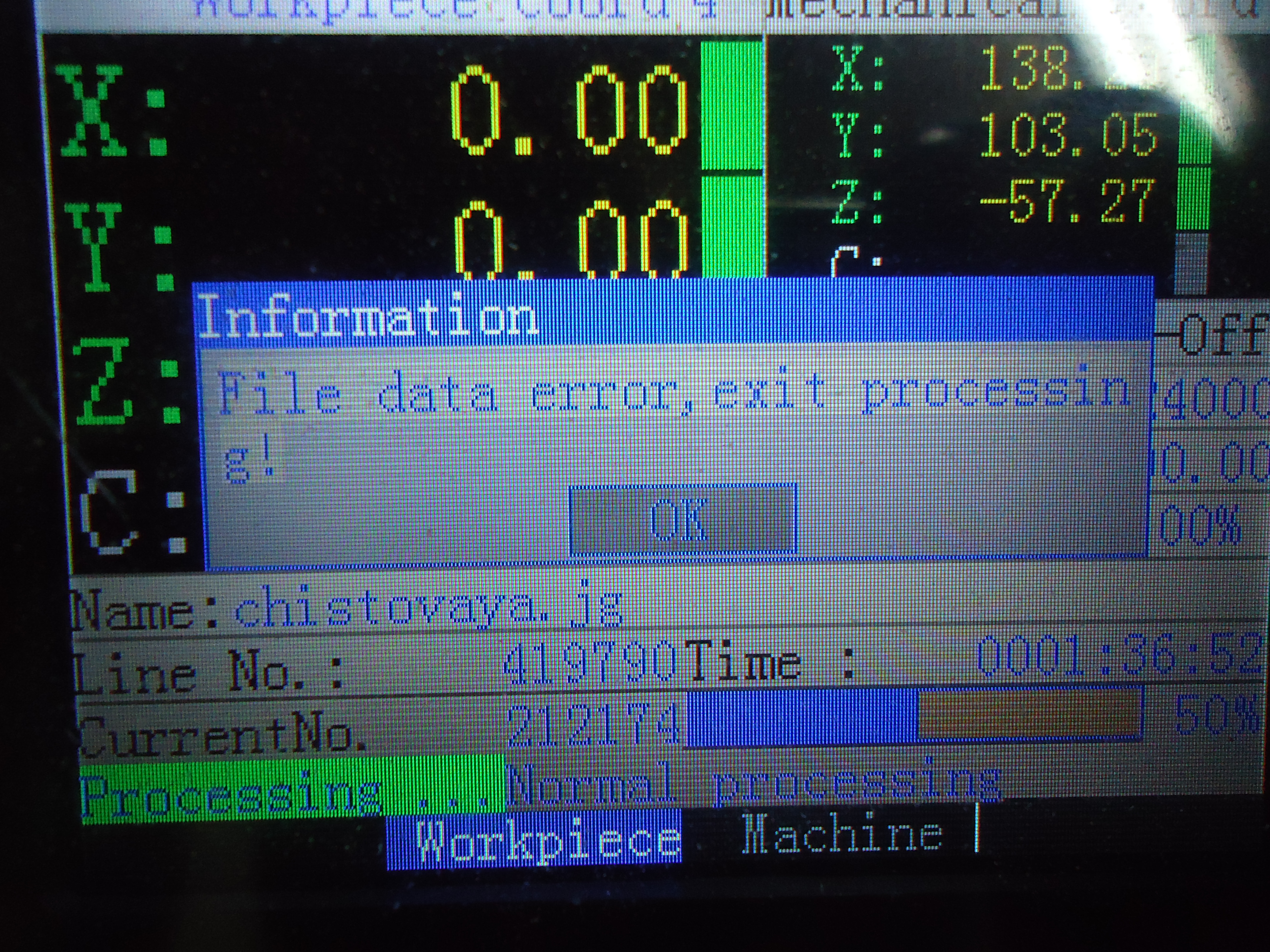 Здраствуйте! Подскажите пожалуйста...режу герб второй раз,черновую проходит без проблем,а чистовую останавливается фрезу на 50% и едет домой,в G-code никаких проблем,т.е. программа правильная. В чем может быть причина?? Грешу на Арткам 2010 скачаный с рутрекера...