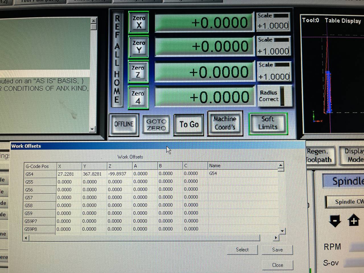 1. Как я понимаю, в g54 хранятся координаты моего рабочего нуля (относительное смещение), т.е. это относительное смещение должно прибавляться к координатам заготовки в УП (что у меня не происходит) или происходит, но так как будто в g54 нули (но это не так) на скрине видно..