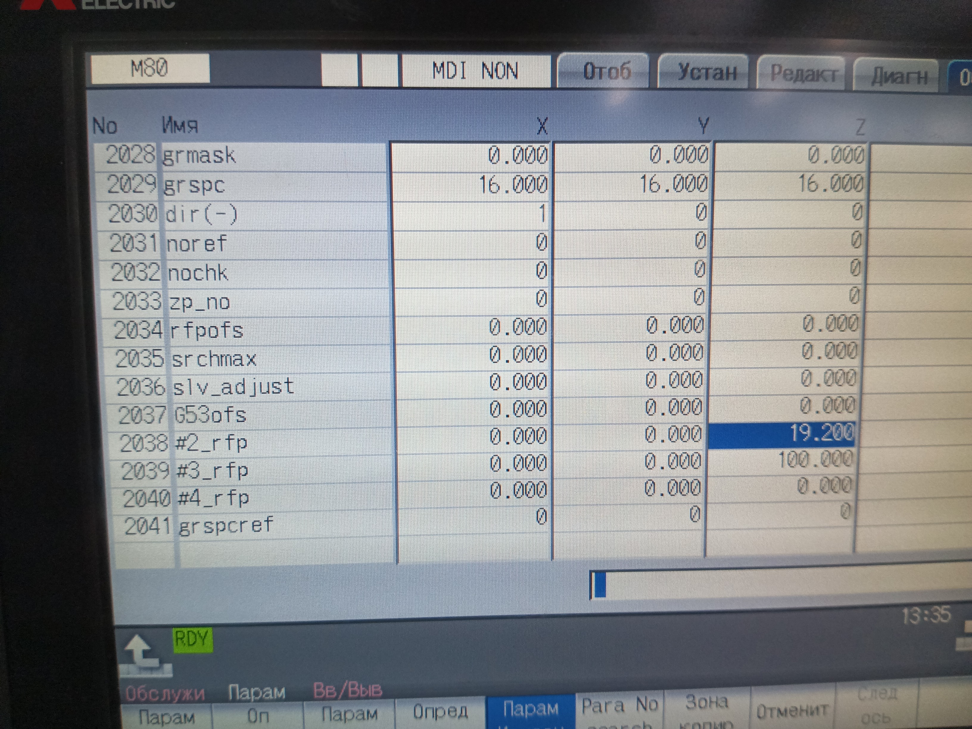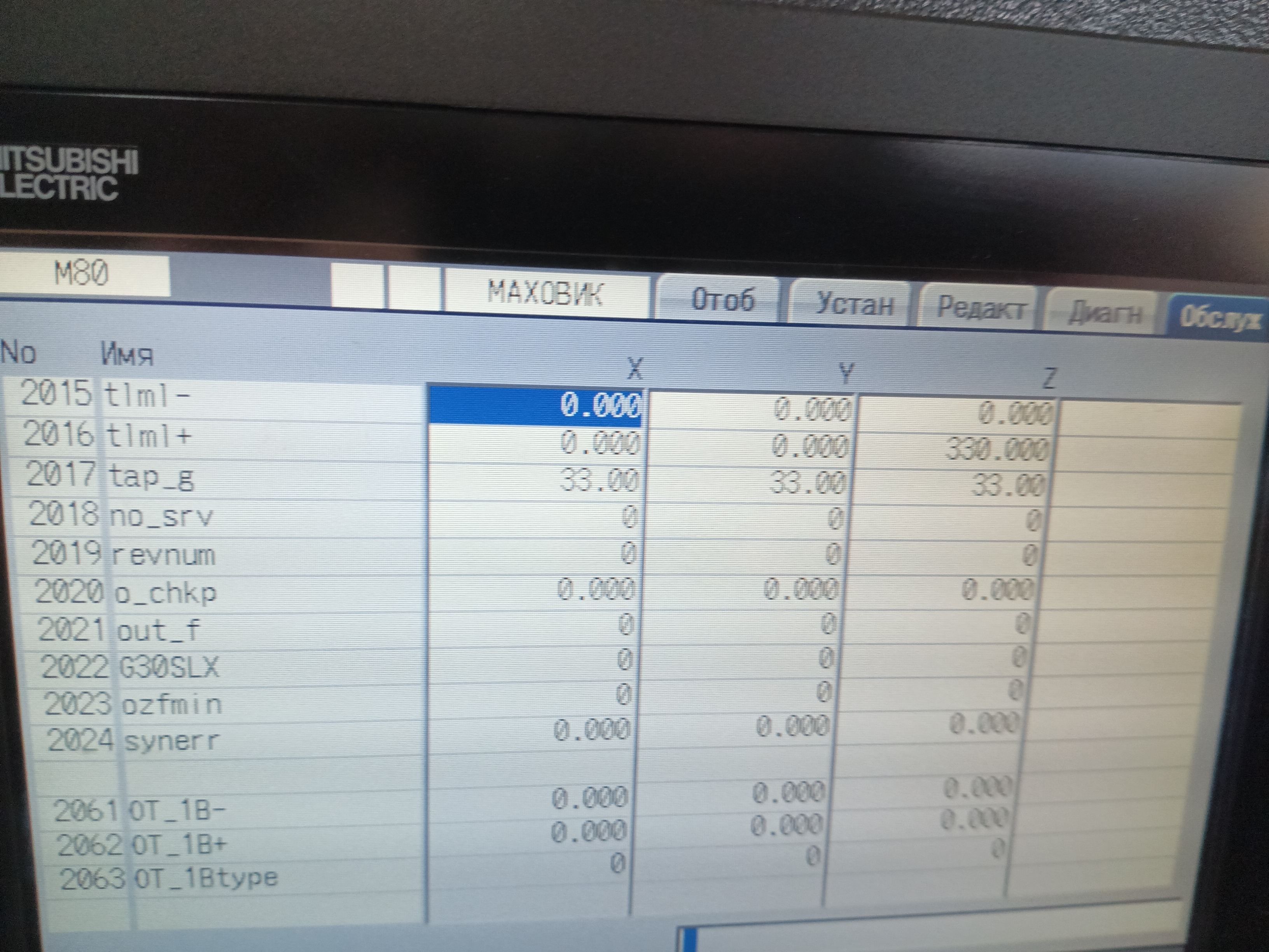 Добрый день. Помогите разобраться с проблемой на станке под управлением Mitsubishi M80. Проблема заключается в том, что при смене инструмента стойка падает в аварию (М01 программное ограничение перемещения 0007 Z). В MDI заказываем сменить инструмент один, два раза меняет, на следующий раз ошибка. Иногда при пуске смены инструмента останавливается, и в окне оставшиеся команды пишет значение 13.845, хотя сами оси находятся в нулях.