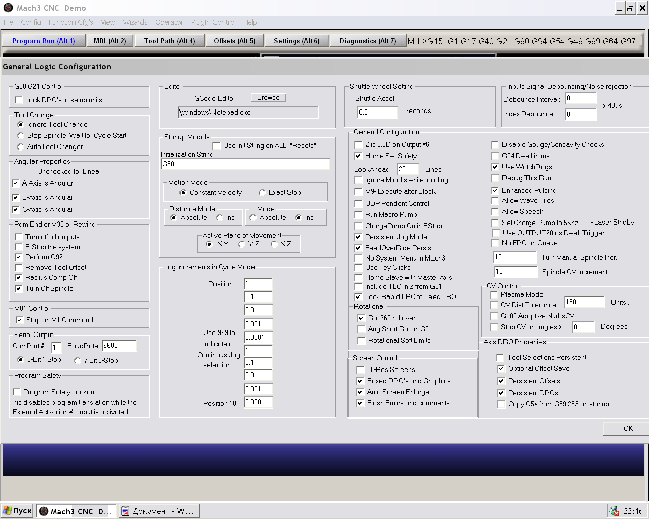 Есть проблема с поворотной осью. Оговорюсь, ось А раньше не использовал, пытаюсь настроить впервые. Обкатывал работу оси при выключенном шпинделе и без фрезы и как выяснилось не зря - эта методика помогла понять некоторые особенности. При выполнении УП MACH по коду УП должен проворачивать на несколько градусов заготовку, отрабатывать осью Y и снова сдвигать и так все 360 градусов. А происходит следующее: поворот с 0-ля до к примеру 1-го градуса происходит через проворачивание оси А на 359 вокруг оси. Другими словами, каждый сдвиг (поворот по оси А) происходит не по кратчайшему расстоянию, а через проворот оси А в противоположном от кратчайшего направлении. Прочел много форумов, где хоть как-то поднималась эта проблема, но ничего не нашел, либо тема на форуме переходила в обсуждение другой проблемы http://mir-cnc.ru/index.php?/topic/3551 ... B2-mach-3/ , либо решением являлось изменение всех отрицательных значений параметра при оси А на положительные. Я поменял часть значений моего G-кода прямо в MAch(там есть возможность редактирования G-кода прямо в окне программы) и как не странно станок отрабатывал поворот как нужно, шел в соседнюю точку по оси А не прибегая к повороту оси на 360 минус заданный угол, значению, а по кратчайшему пути. Когда была подготовлена программа в Милле с положительными значениями для А, как ни странно станок продолжал наворачивать ненужные круги осью А.