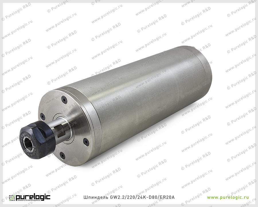 Трехфазный электрический шпиндель водяного охлаждения. 2200Вт/220В/8A, 8000-24000об/мин (130-400Гц), цанга ER-20, диаметр под крепление 80мм. Вес 5кг.