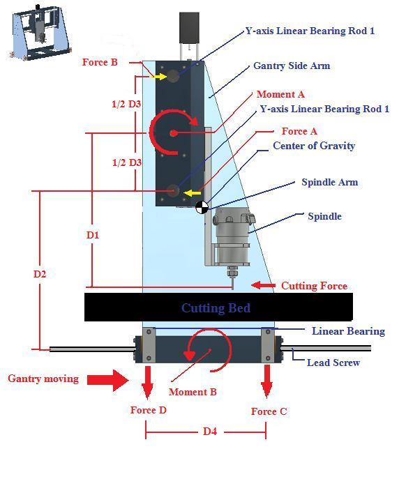 Скорее всего konyshevk имел в виду другое. Нужно изменить конструкцию боковин, сделав их в виде прямоугольного треугольника (как вариант), сооствеетственно сможешь сдинуть дальше вправо. Ну и рассчитать центр тяжести всего портала вместе со шпинделем, в идеале он должен распологаться по середине между двумя подшипниками, что по рельсе Х бегают.