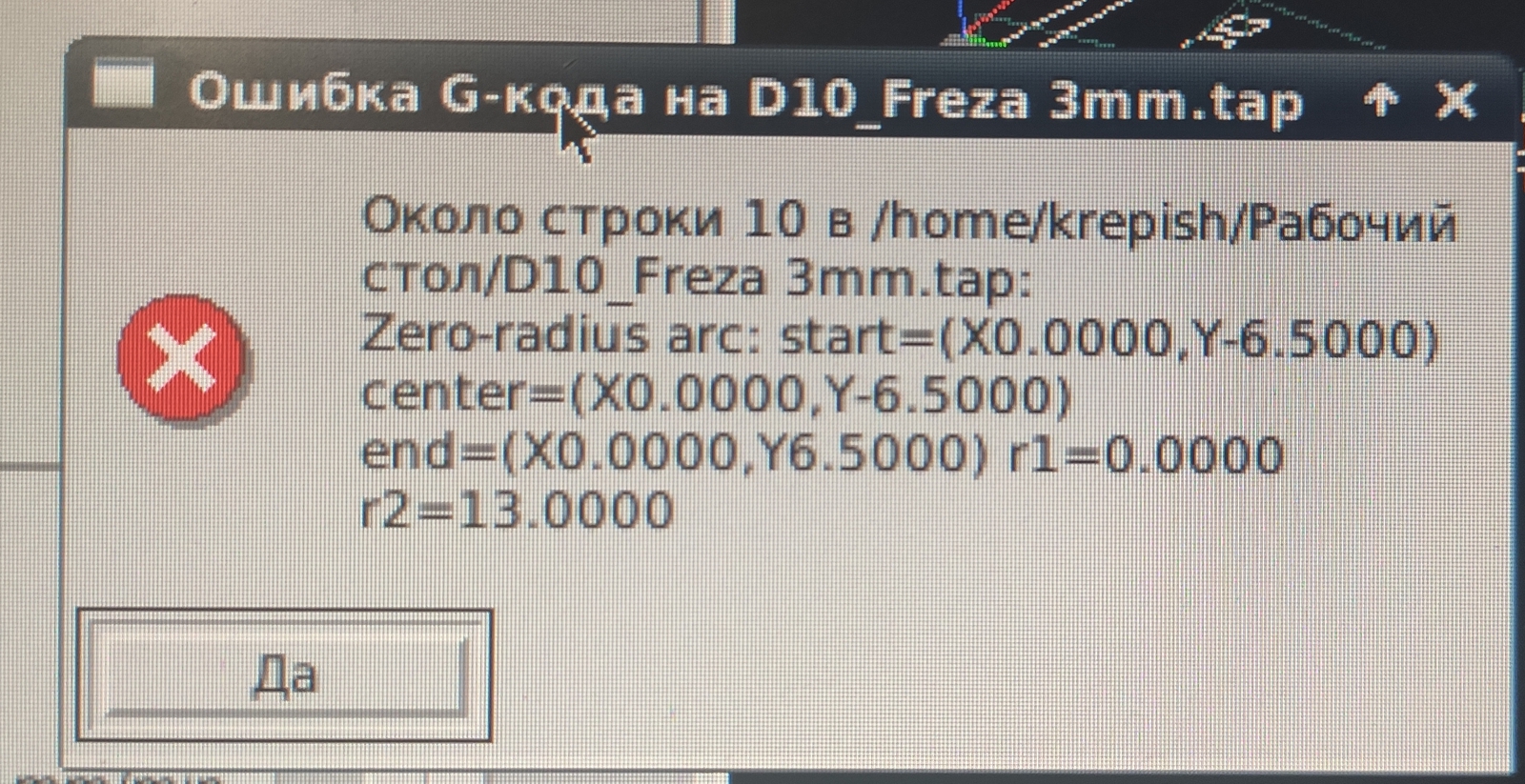 Но если в УП кол-во знаков после запятой (tolerance) меньше чем в линуксцнц, то будет выдавать так же такую ошибку.. (касается только круговой интерполяции)