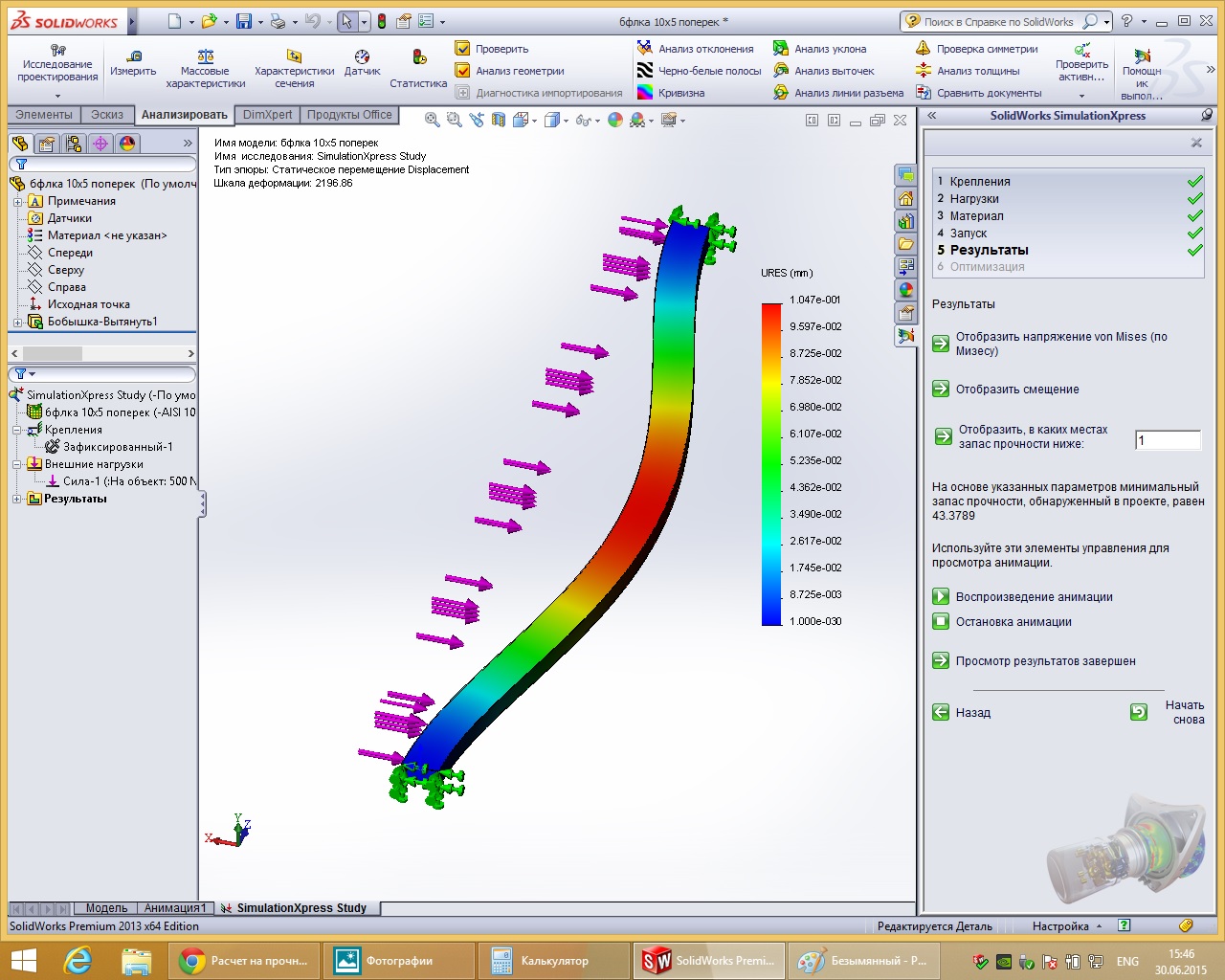 Кто разбирается? сделал в SolidWorks балку 10х5см 0.2мм 2200см и на нее нагрузку в 50кг , правильноя понимаю в самом красном месте прогиб 001 мм? И что то мне пподсказывает что эти 50кг равномерно по всей распределены!?