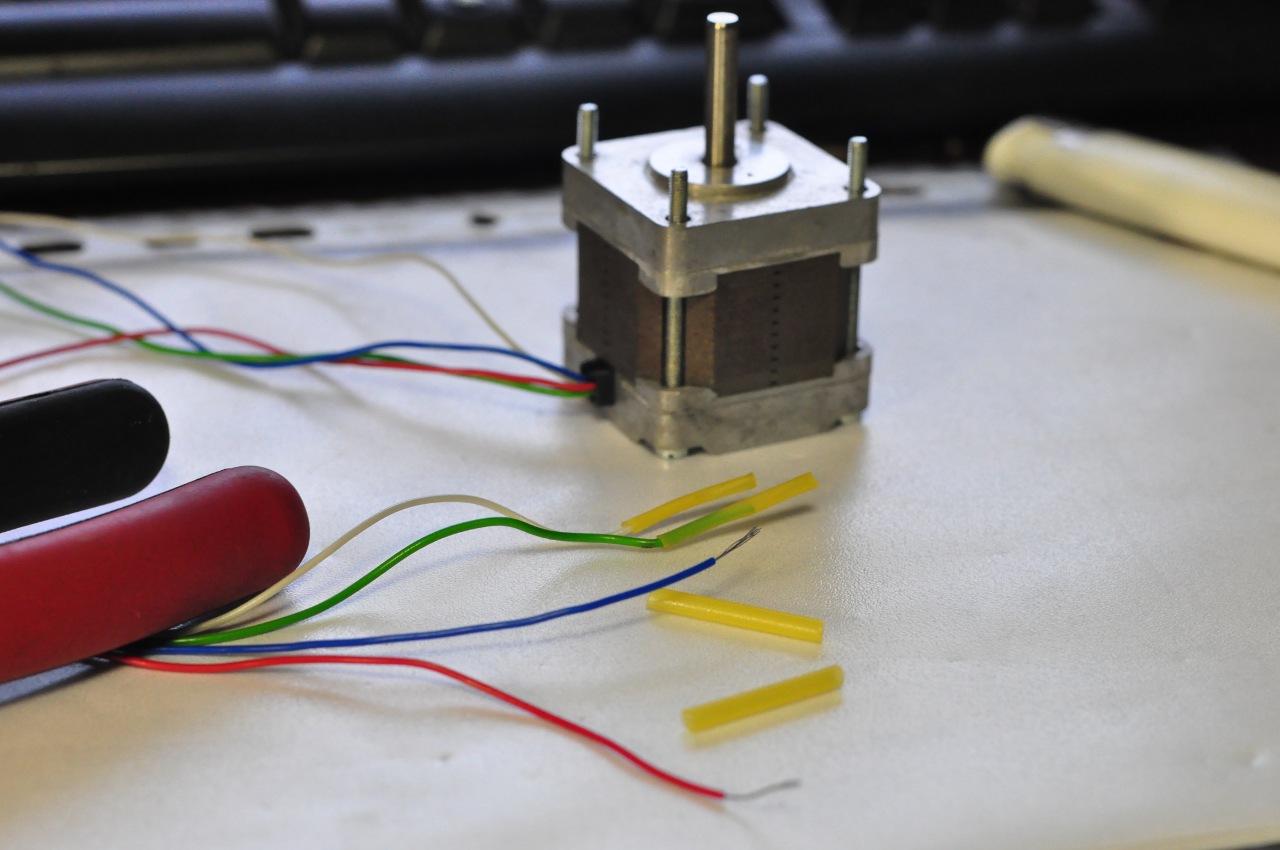 Как обычно, возникла проблема: у двигателей от PureLogic провода раскрашены в красный, оранжевый, зеленый и синий цвета а у двигателей от МНТЦ в красный, белый, зеленый и синий. Я представил себя немного дальтоником и приравнял оранжевый к белому. Но не тут-то было, двигатель отказался работать как надо. Пришлось с помощью тестера проверять какие провода принадлежат к одной обмотке. МНТЦ-шники брали двигатель от Элион, у меня оказался SM200-0.22-1-0.2.