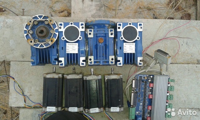 ШД Nema 23hs2406 -4шт 1700 руб, редукторы NMRV40-80 - 4шт(пер отнош 80, межосевое 40мм) 1800 руб,контроллер 4оси Мач3 6B6550-4v4 1400руб.