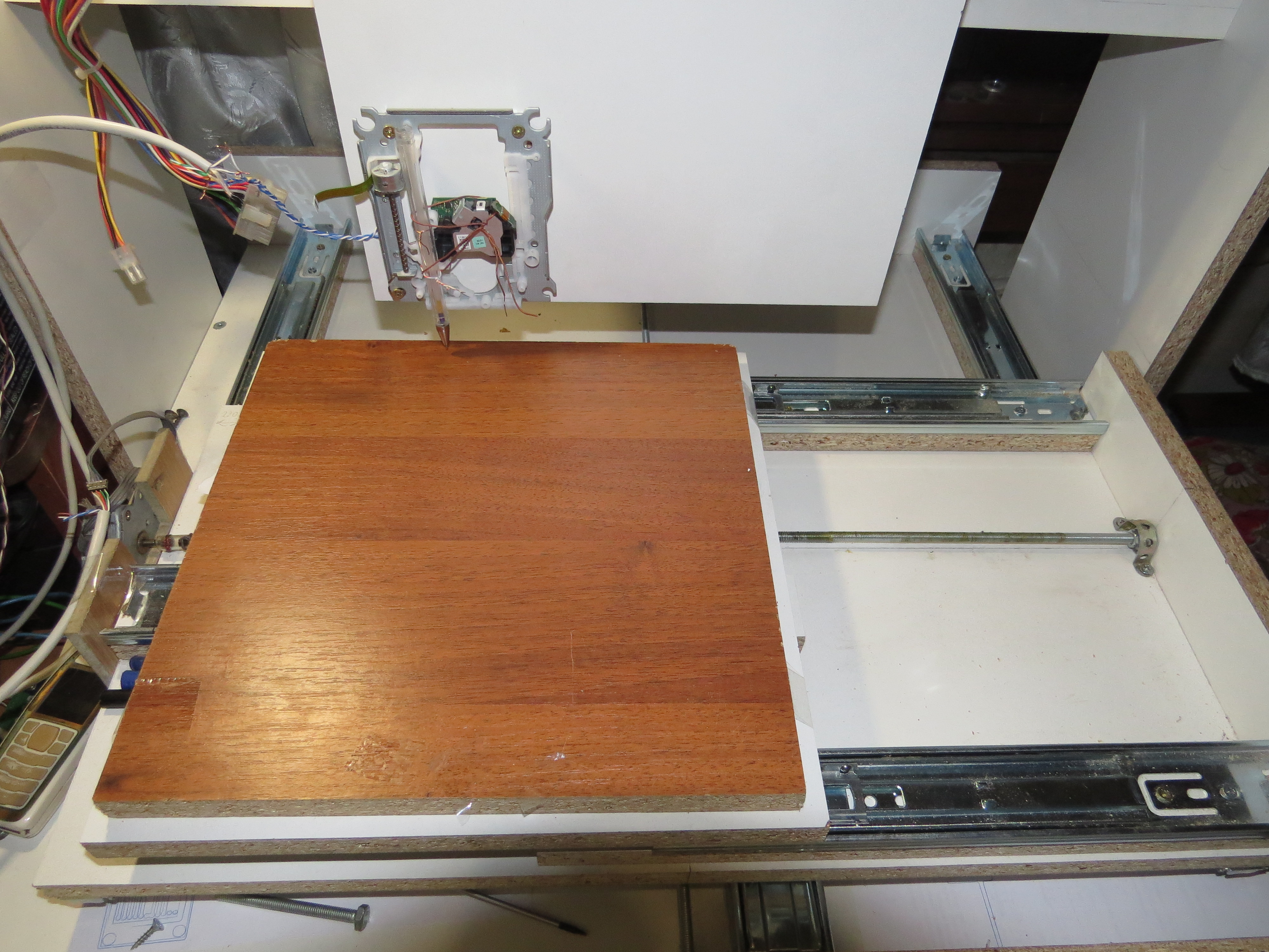 Ещо много надо доделать, например ось Z не подимаетса моторчика не хватает, думаю над редуктором, временно поставил ось Z из сидипривода и уже поет и рисует)