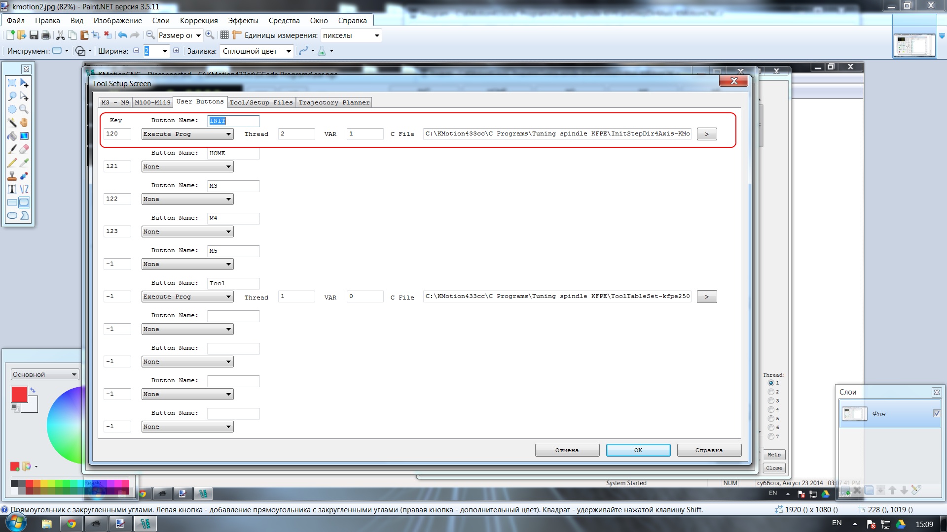 Еще одно чтобы с панели заработали кнопки М3 и М5 надо еще дополнительно перейти в Tool Setup затем на вкладке User Buttons прописать эти кнопки так же как и в вкладке Мкодов.
