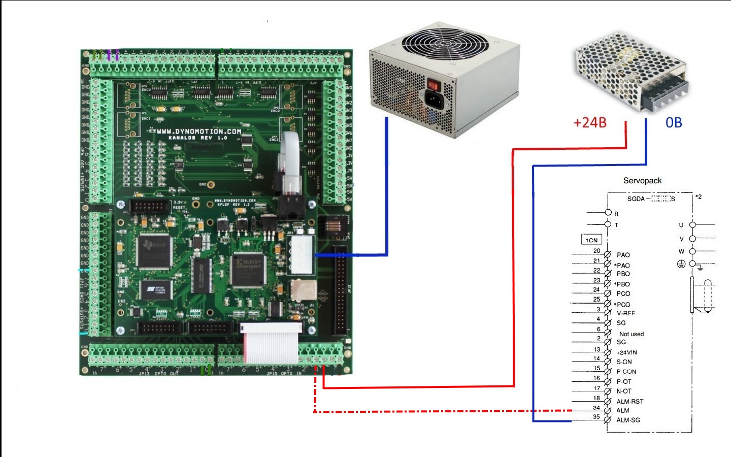 Всё довольно просто. Выход привода Alm действует, как переключатель. Т.е. в рабочем состоянии выводы Alm и Alm-Sg между собой замкнуты, а при ошибке привода разомкнуты.
