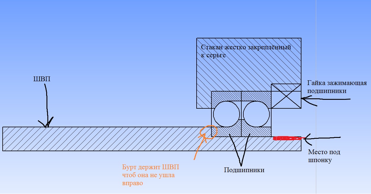 2. При нагрузках направленых "Вправо" вроде всё нормально и бурт удерживает винт и он не куда не выходит...а вот при нагрузке "Влево" он наровит выскальзнуть из подшипников...Его как то необходимо зафиксировать(я так думаю) Как это сделать? Поставить до шпонки(условно говоря зона зачирканая красным) стопорное кольцо?(сколько сталкивался с ними всегда остаётся место(люфт) между подшипником и этим кольцом,или же я его вовсе не вставлю..да и утоньшать швп в этом месте не хотелось бы...