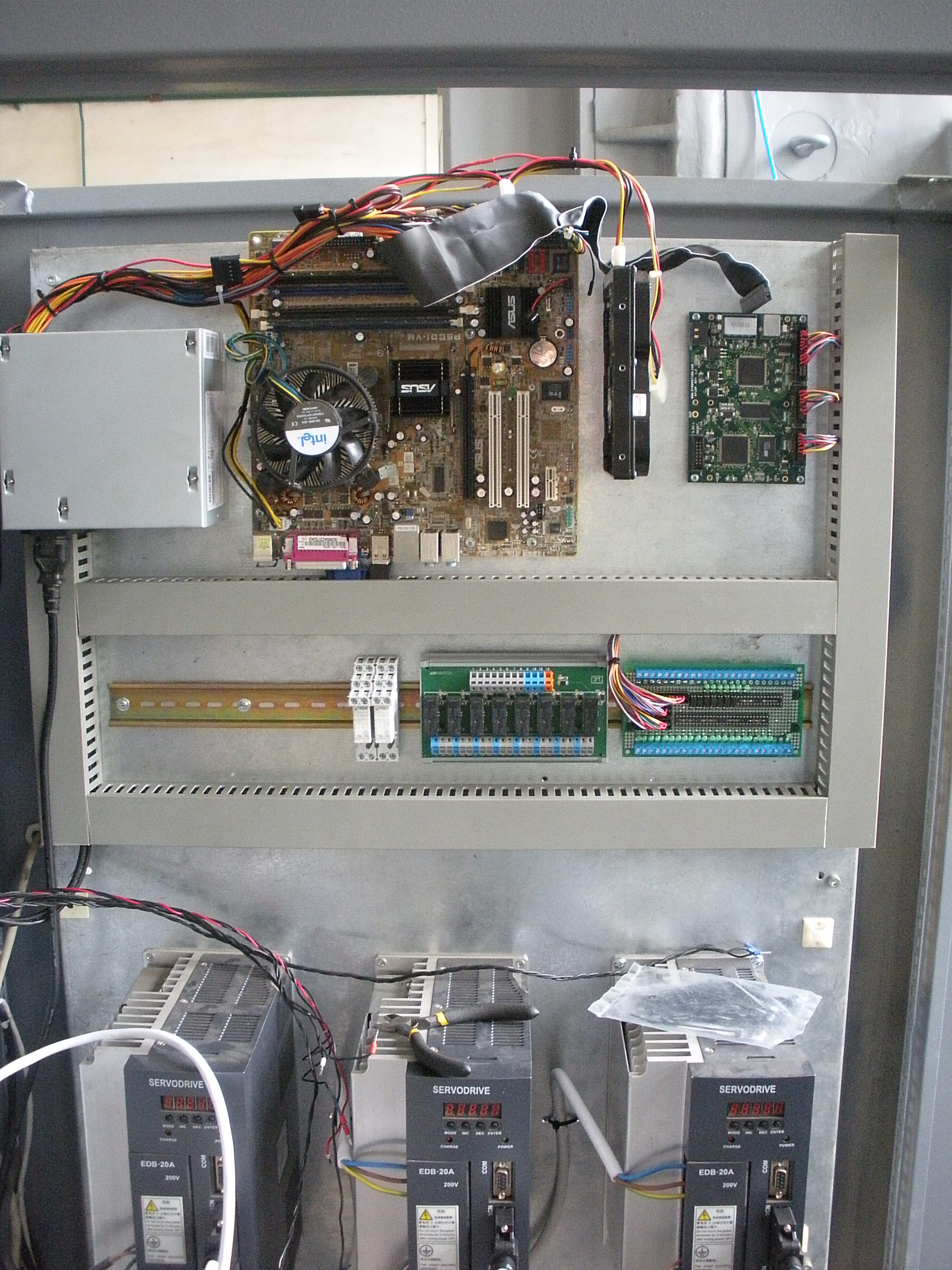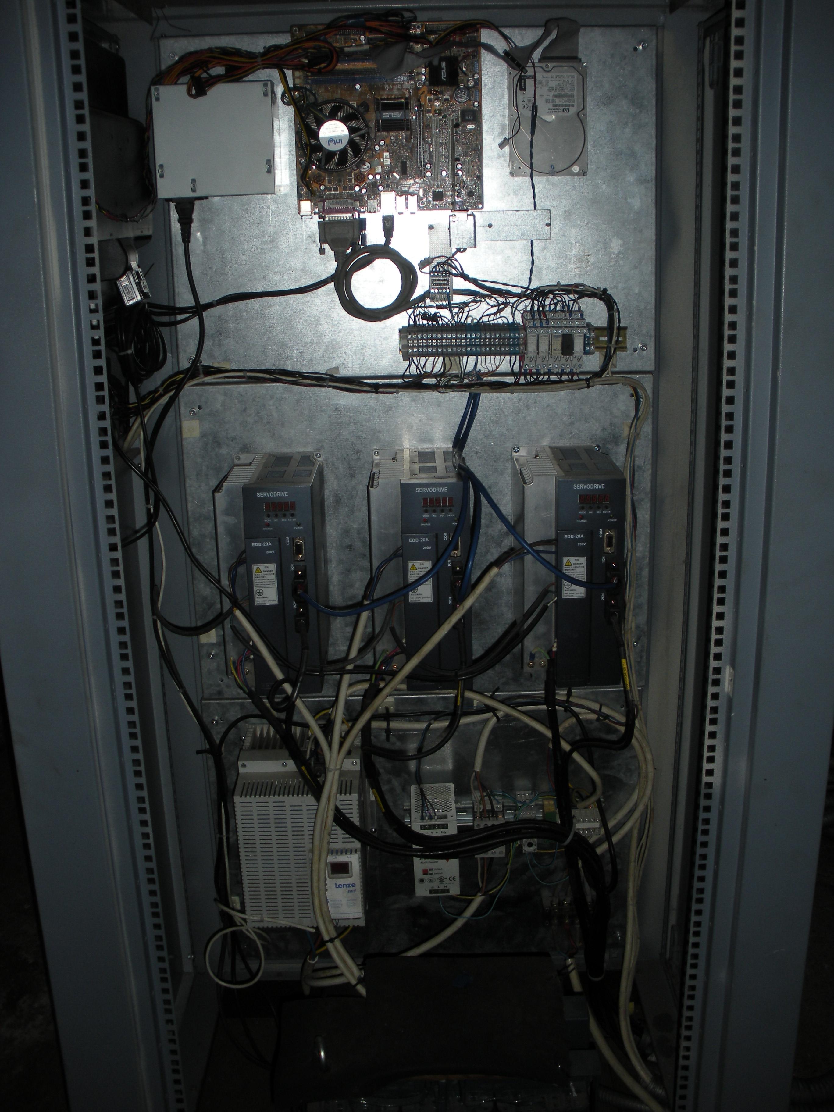 Управление сервами заведено напрямую в LPT, никакой защиты от аварийных ситуаций, все на соплях... Провода легким движением руки вытаскиваются с клеммников (силовые на частотнике, сервах).