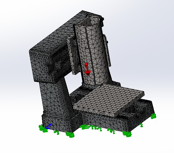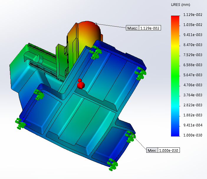 Зафиксируем заднюю плоскость портала и проведём исследования. Сила тяжести + 2000 Н на верхнюю плоскость заготовки. Смещение макс. 0,001374 мм. На нижнем кольце шпинделя. Смещение заготовки 0,0007 мм. 7. Нарисуем на нижней поверхности станины предполагаемые ножки в виде кубиков. Так как плоскость определяется тремя точками, предполагаем, что из-за неровностей поверхности установки станина будет опираться именно на три ноги. Пусть будут эти. 8. Запустим моделирование с одной силой тяжести. Макс. =0,03934 мм. Верх кожуха.