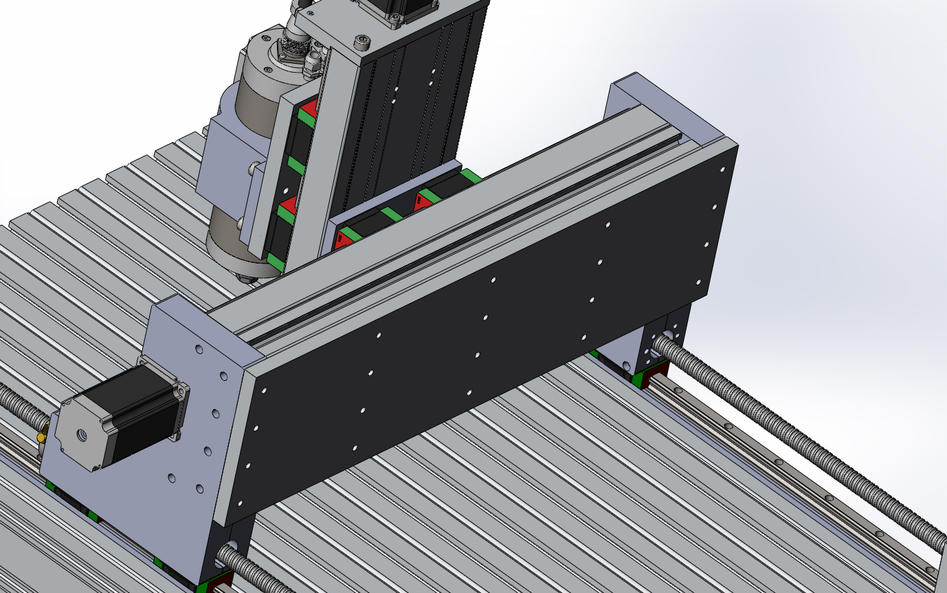 Только немного модернизировал, упростил изготовление, сделал горизонтальный упор для портала и поставил фланцевые каретки. Состоит из двух предварительно отфрезерованных скрученных и склеенных пластин 29 мм. Портал дополнительно крепится к боковинам снизу двумя болтами. Такая конструкция ног портала упрощает изготовление отверстия под гайку и делает крепче всю конструкцию.