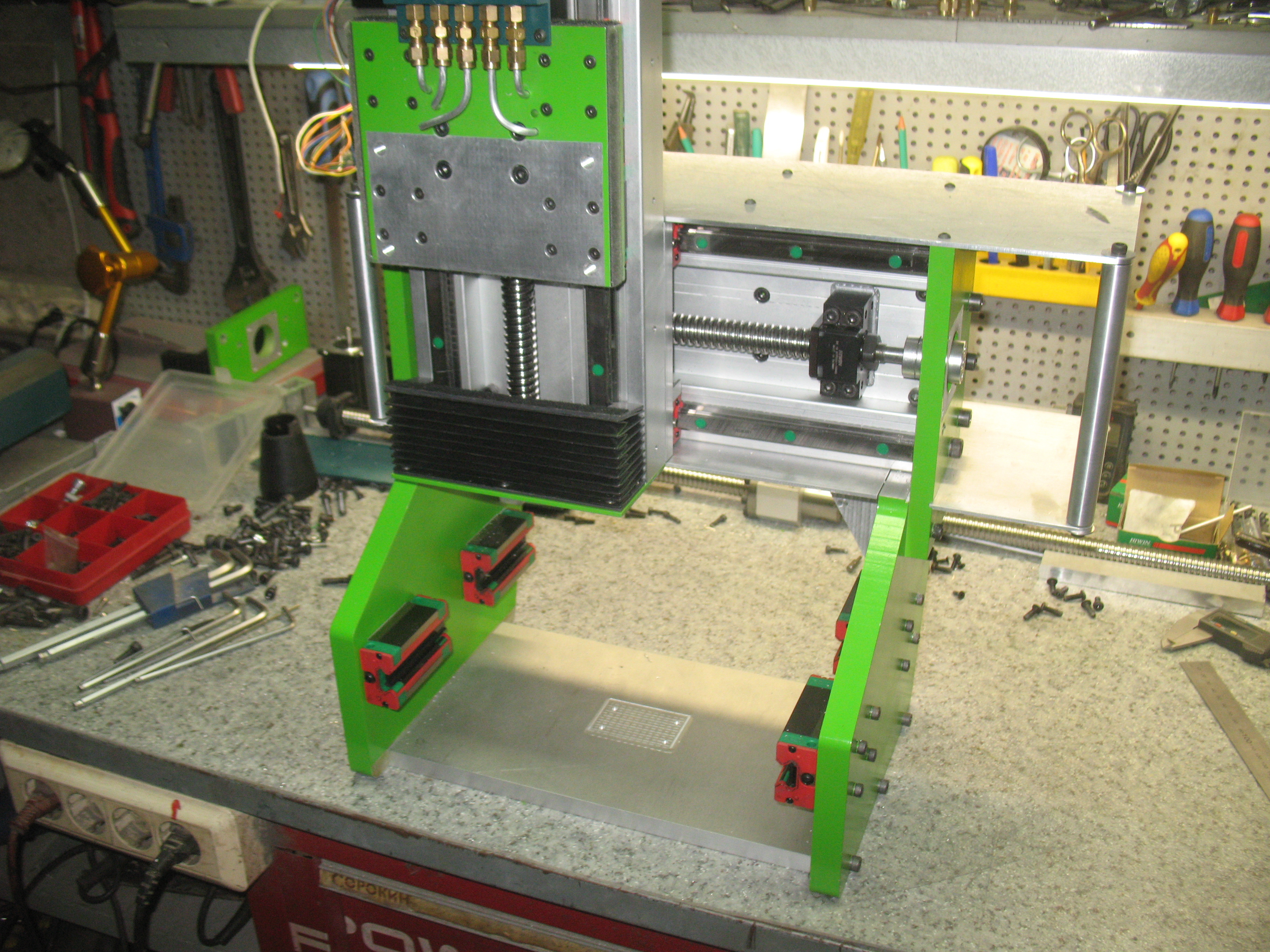 На выходных прикрутил нижнюю пластину, которая под станиной. Для этого пришлось портал снимать со станка, 120 кг особо не покрутишь чтобы всё ровно выставить.