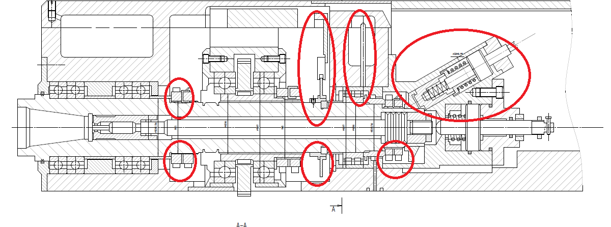 слева - гайка "затяжки" подшипников и ее контрогайка, далее, скорее всего датчик положения шпинделя, далее возможно масляный канал к задним подшипникам, потом снова гайки, только уже задних подшипников, а самая правая - не уверен, у меня ее нет, т.к. все разобрано было варварски, но я предположу что это фиксация шпинделя в конкретном положении, что позволяет на пару с датчиком встать в положение смены инструмента.