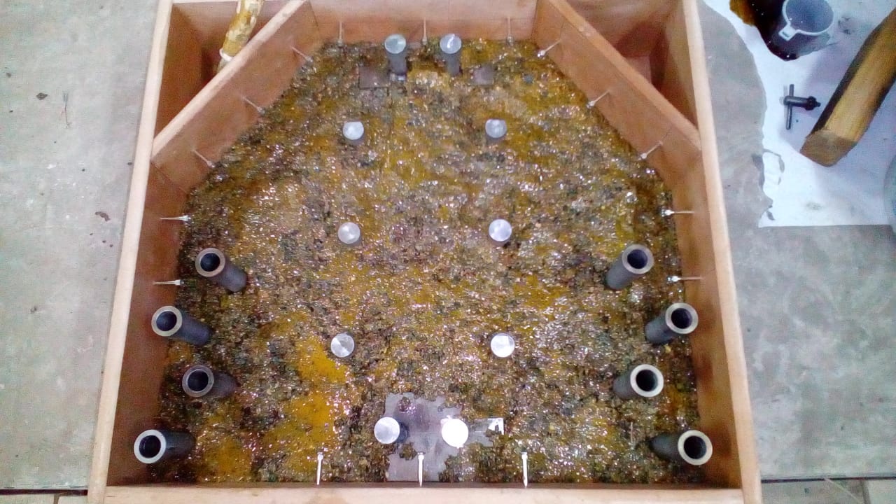 Нет, никакой вибрации, никакой трамбовки, всё вручную. Фактически, в четыре руки "вмазывали" состав. В углах и в тонких, труднодоступных местах трамбовали стальным стержнем и продавливали пальцами (в перчатках, естесственно).