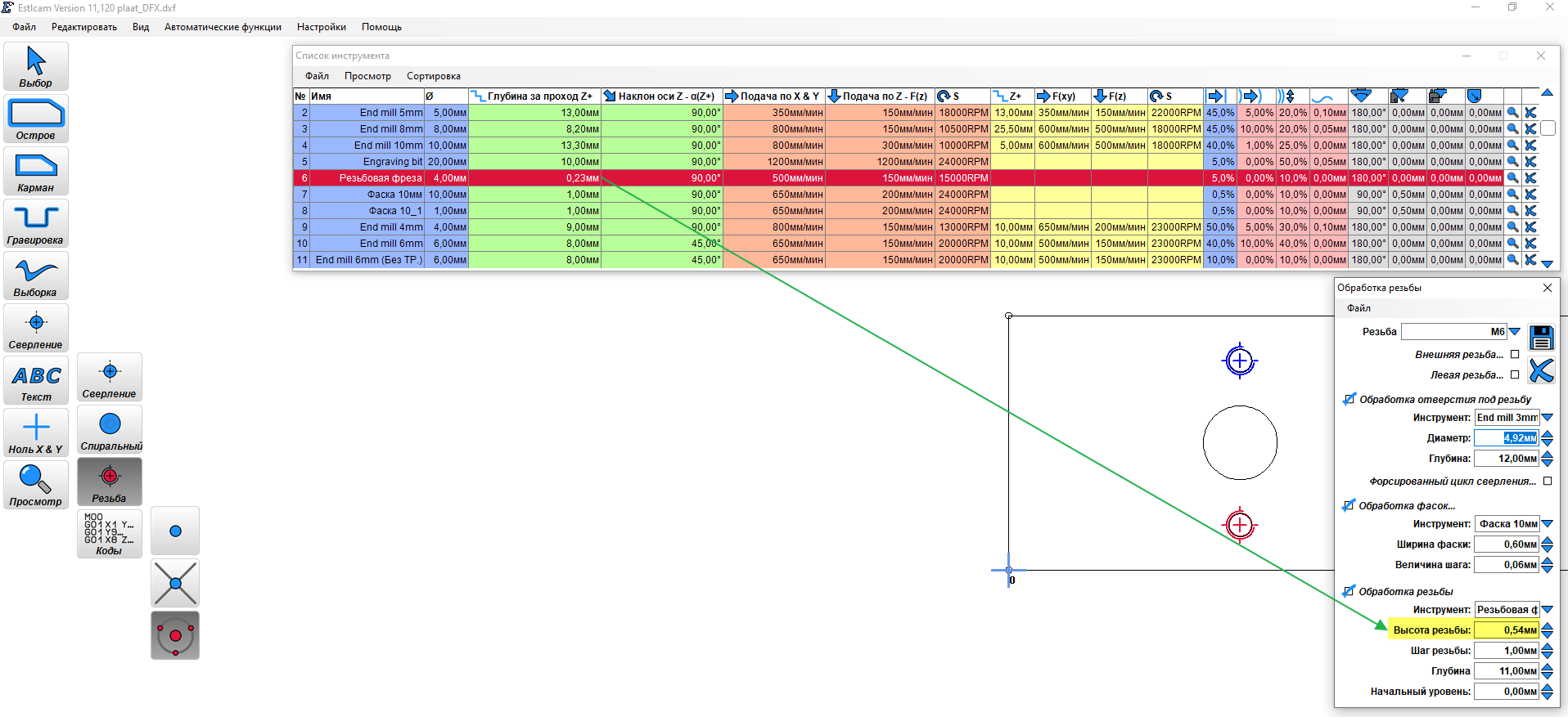 думать ничего не надо, уже все предустанолено... по стандартам резьб стрелкой обозначил (глубина резьбы 0,54мм, за раз фреза снимет 0,23мм, т.е. 0,23+0,23+чистовой проход 0,07мм) можно все корректировать... + впридачу фаска + сверление. А то у вас чето слишком сложно...