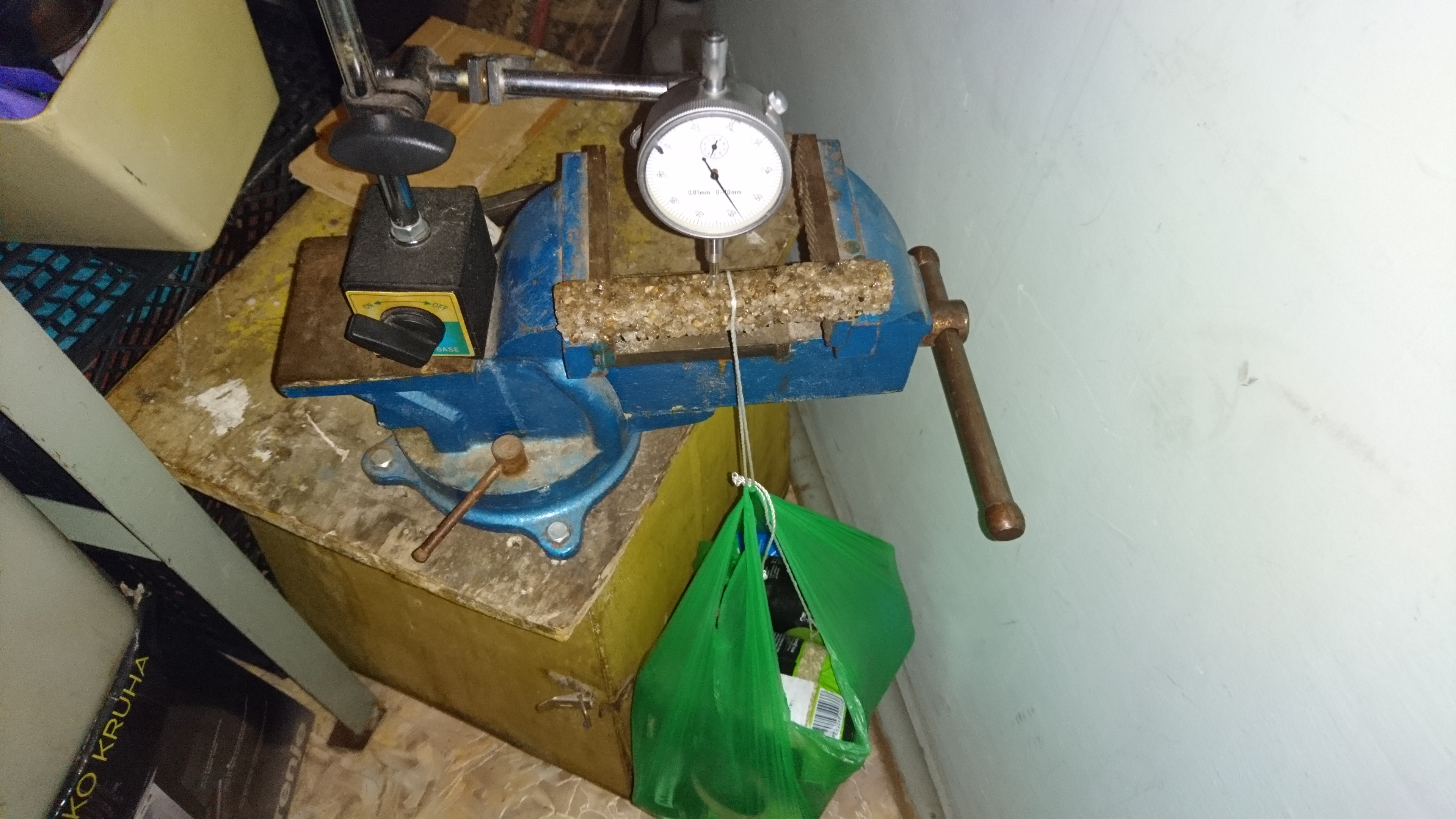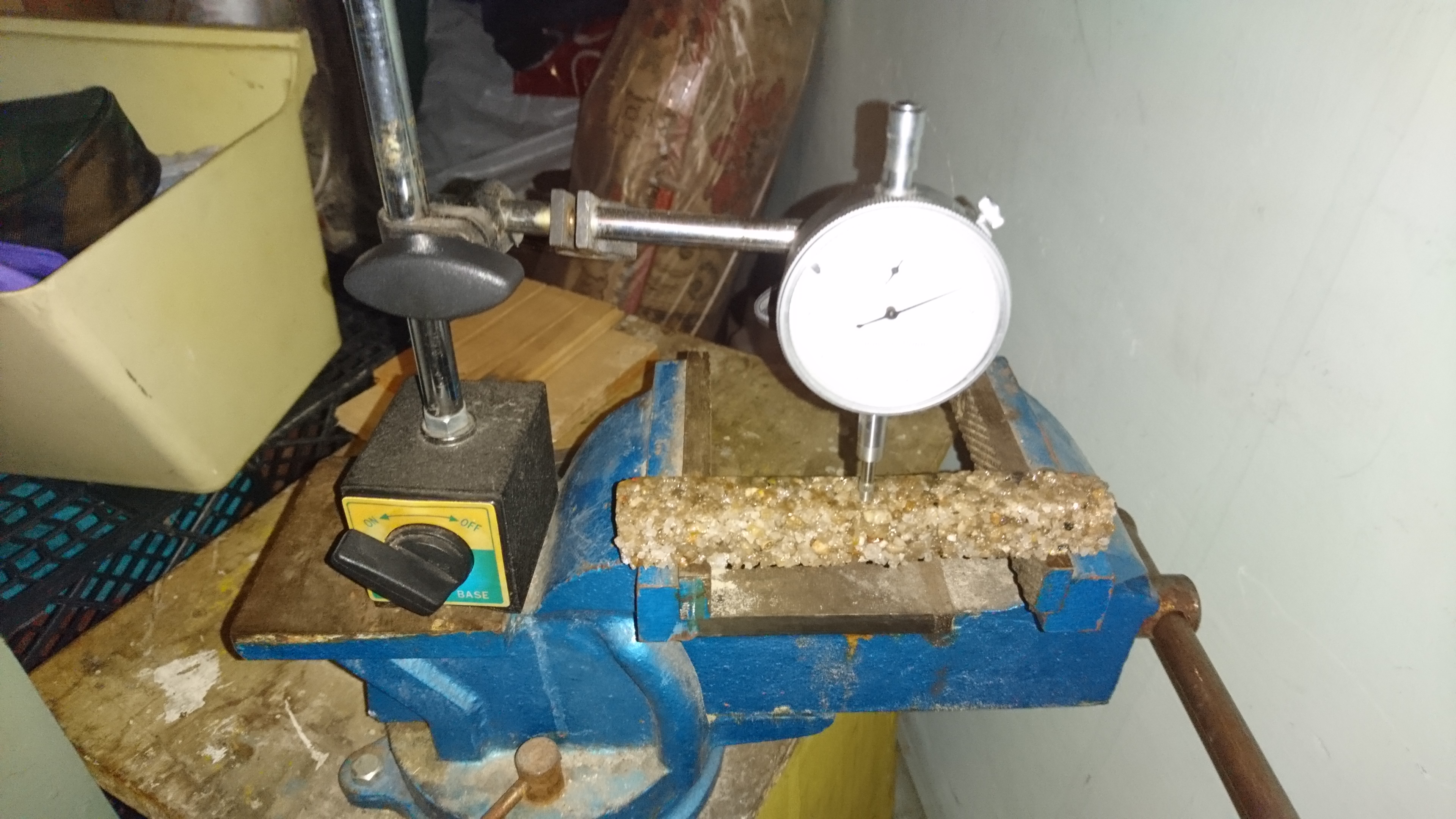 Провёл "испытания" балки на прочность и жёсткость конструкции. Для этого установил её на губки тисков, разведённых на расстояние 100 мм друг от друга. В центре вешал грузы разной массы и смотрел величину прогиба станочным часовым индикатором (см. фото).