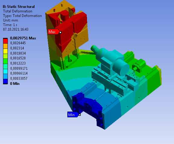 Деформация колонны привела к смещению столика на 3 микрона, а шпинделя - его смещение на 1 микрон. Основание станины практически не деформировалось.