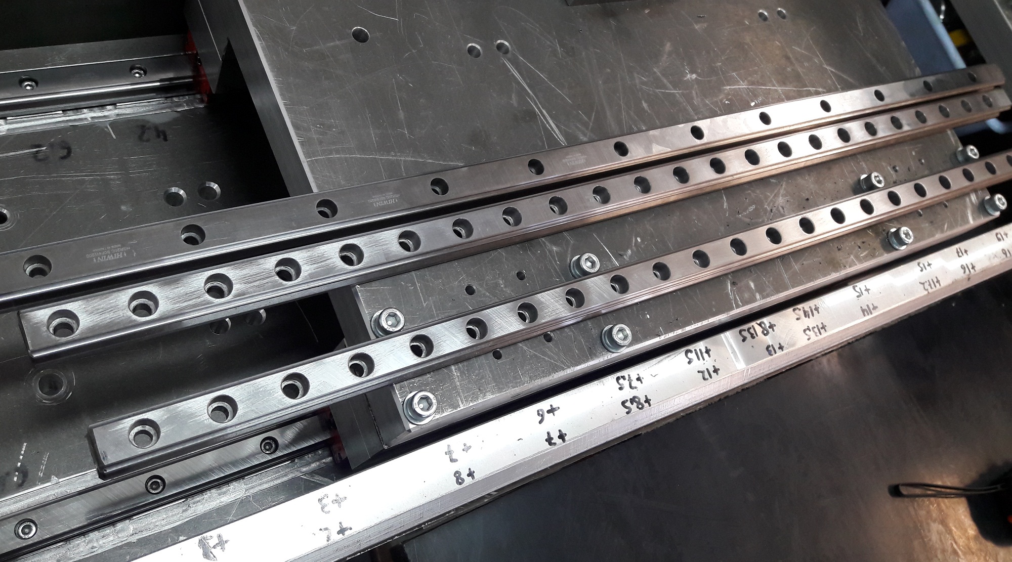 Рельса с поверхностной закалкой, глубина 2-3 мм. На невысоких оборотах просверлил и расточил под винты М6.