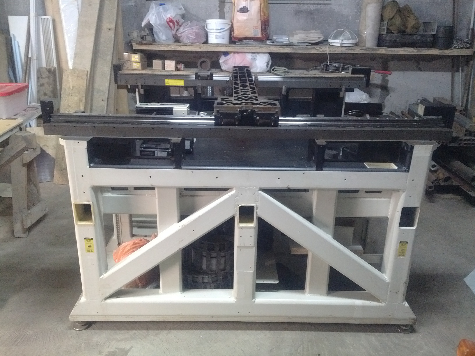 Станина заводская сварная из профтрубы 102 стенка 12. Снизу лист 26 мм, сверху (стол) лист 20 мм. Внутри станины во всех направлениях тоже каркас и диагонали. Вес без всего навесного 2300 кг. Восемь опорных лап.