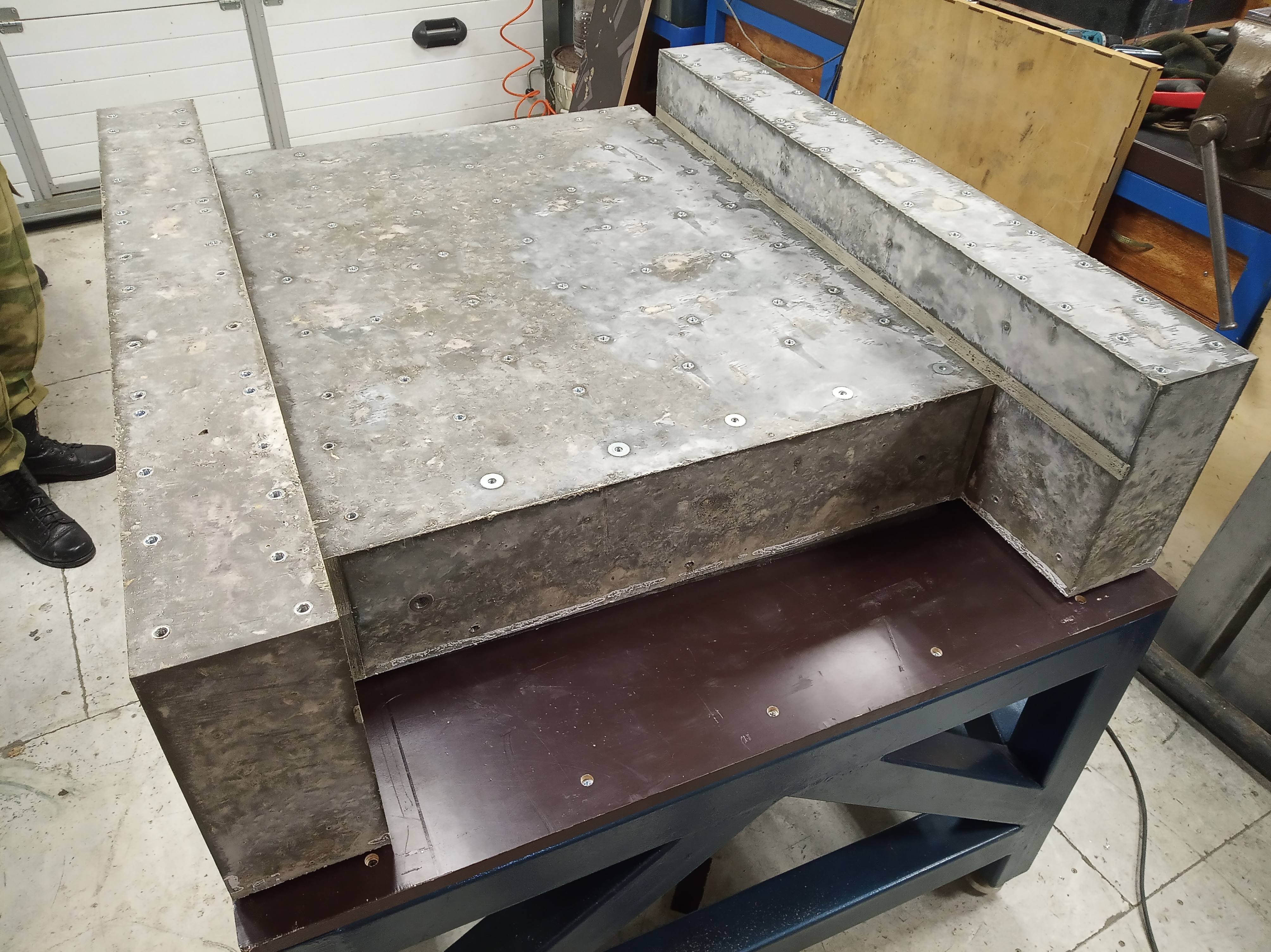 Сварил подставку под станок из трубы 80*80, она естественно получилась с некоторым винтом по верхней плоскости.