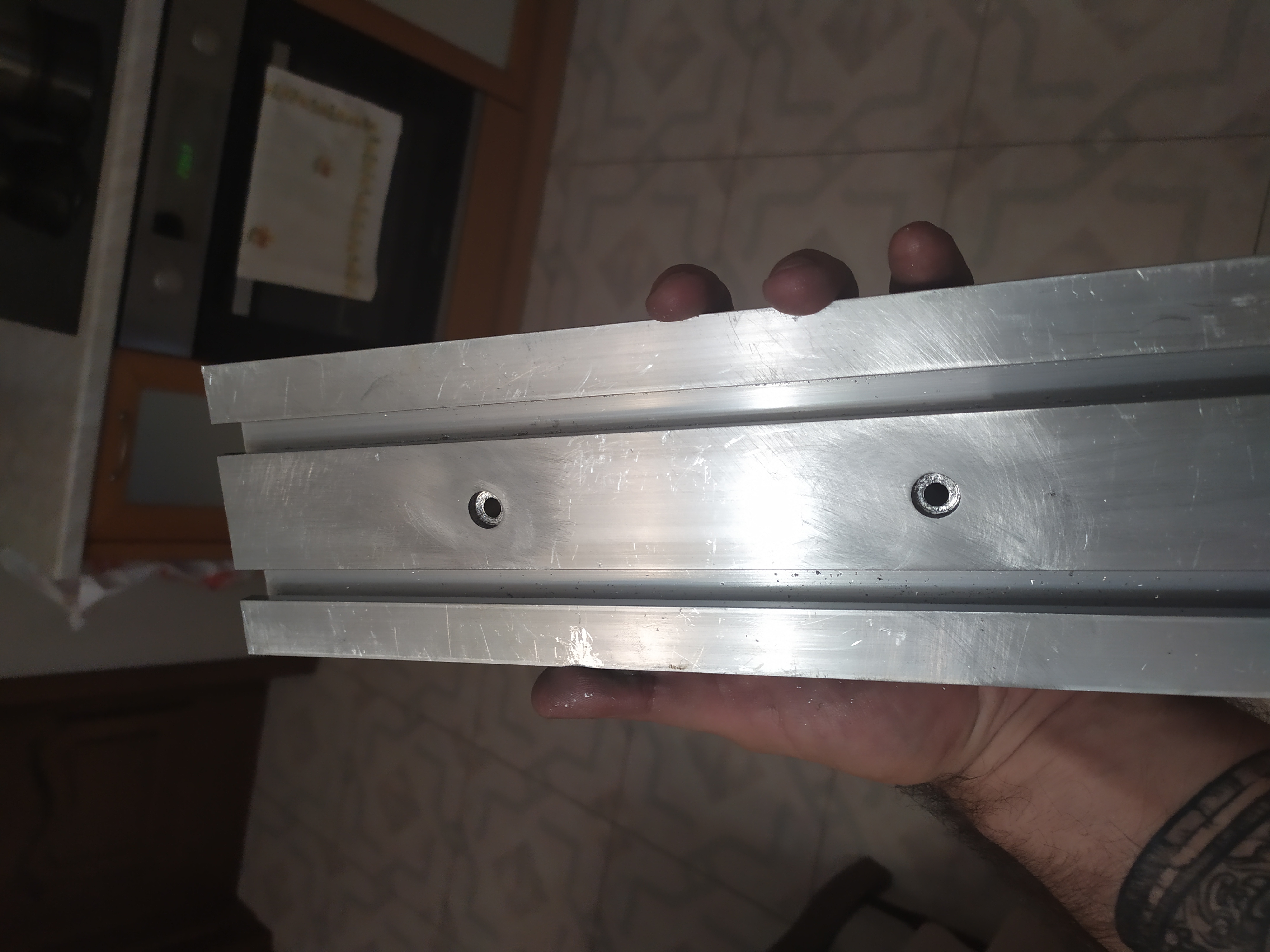 Что не получилось - ровная геометрия. Профиль повело из-за заливки полимергранитом. Плоскость рельс я выставил более или менее, а вот между профилем станины и столом зазоры до 4мм.