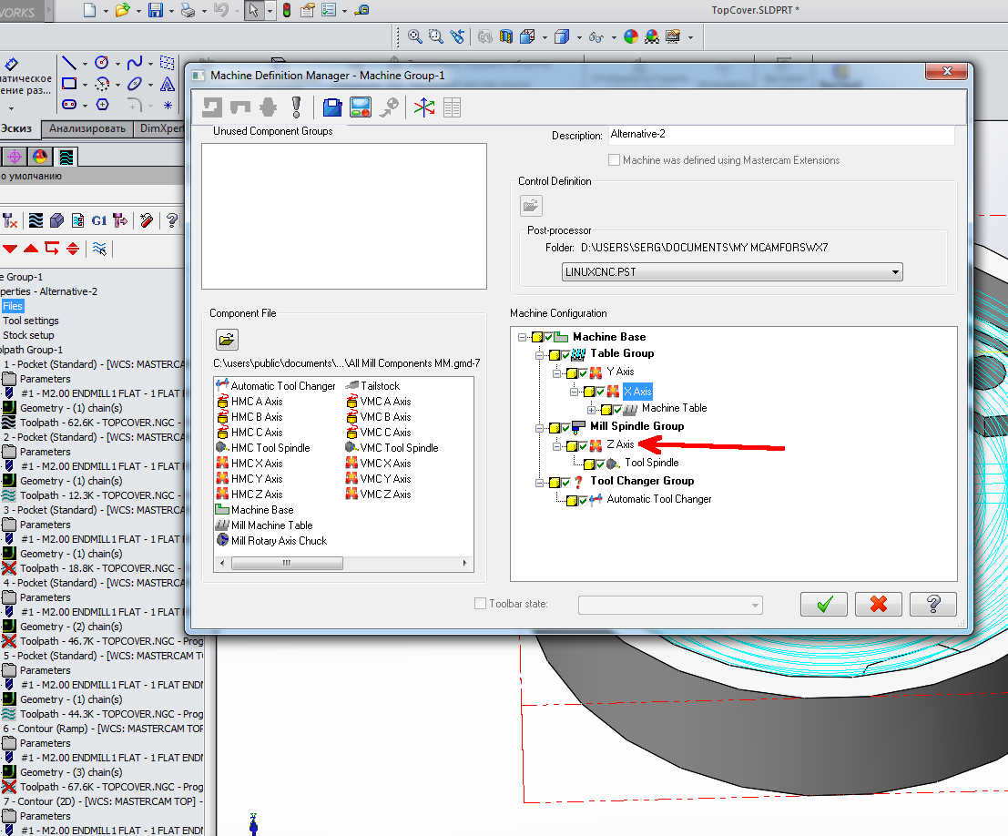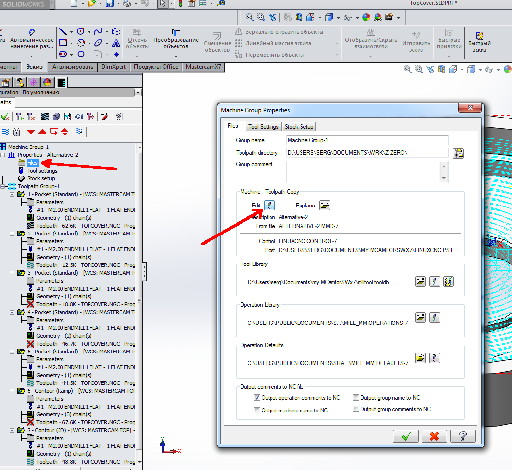 В левом окошке в Machine Group-1 -> Properties -> Files в Масhine - Toolpath Copy жмёшь Replace и выбираешь свой файл.mmd-7.