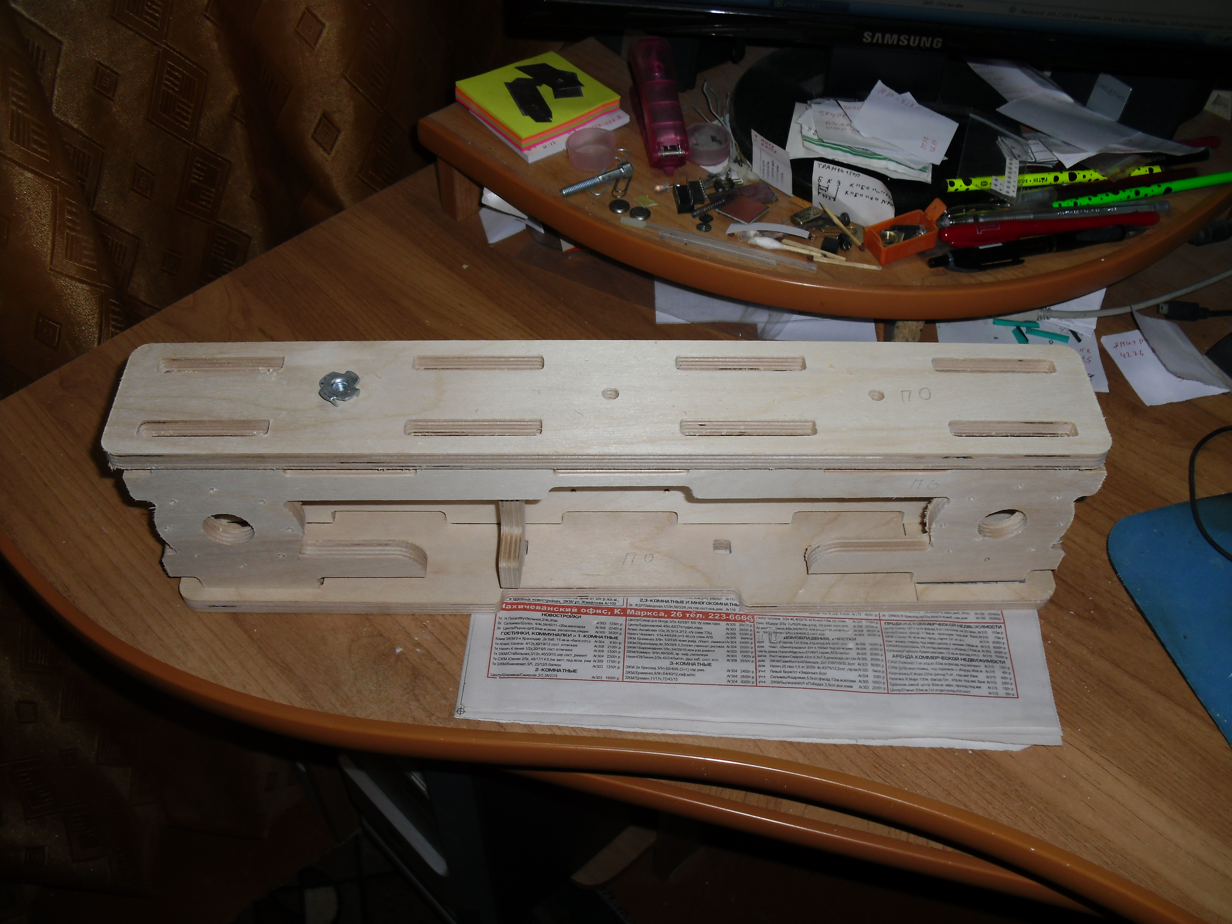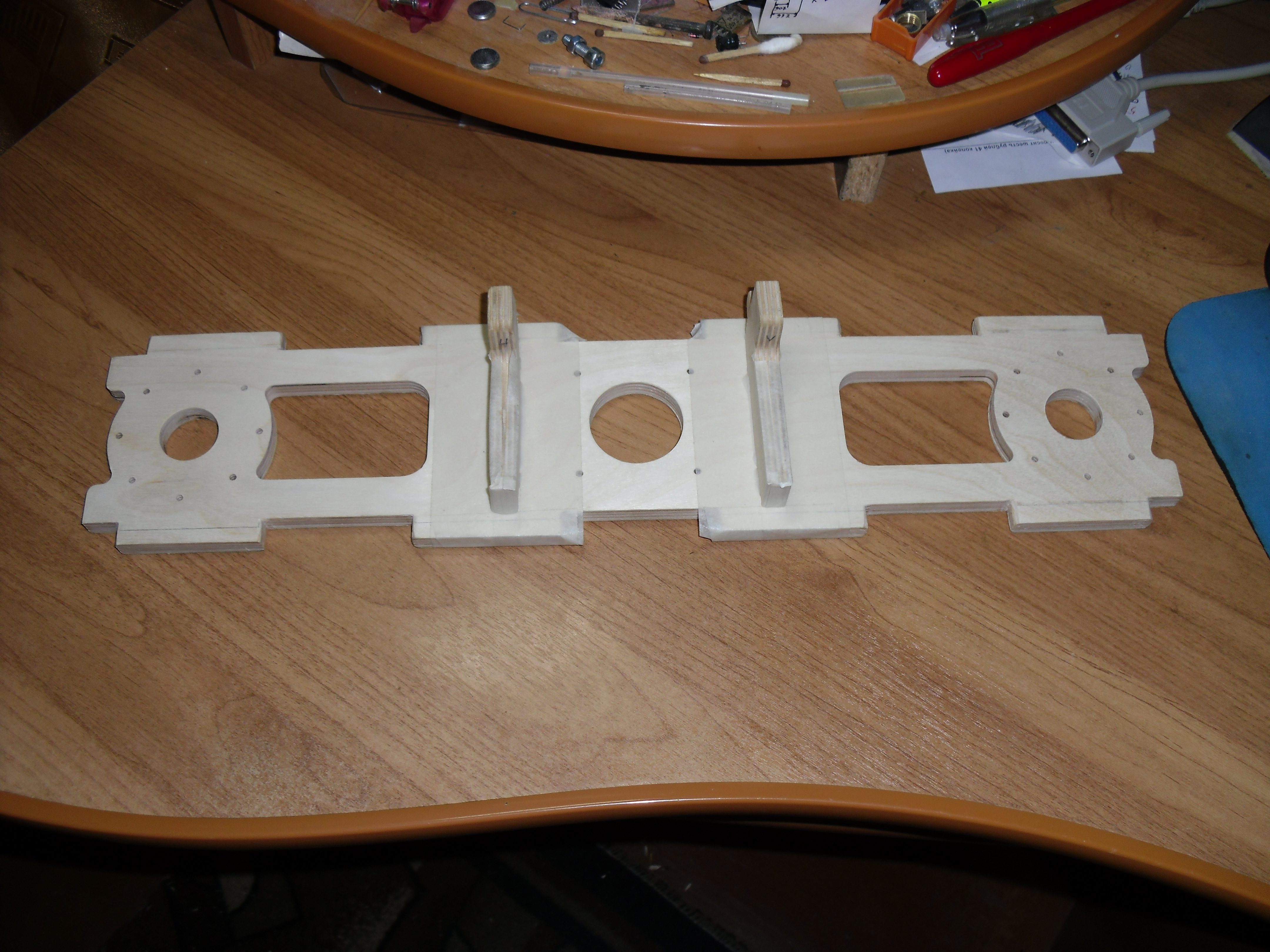В постройке чего либо из фанеры основная засада это то что сама фанера обычно гнутая вином и к тому же сильно «гуляет» по толщине в одном углу может быть 5,0мм в другом 5,4мм причем запросто. В первую очередь подогнал и собрал на сухую обе опоры и траверсу.