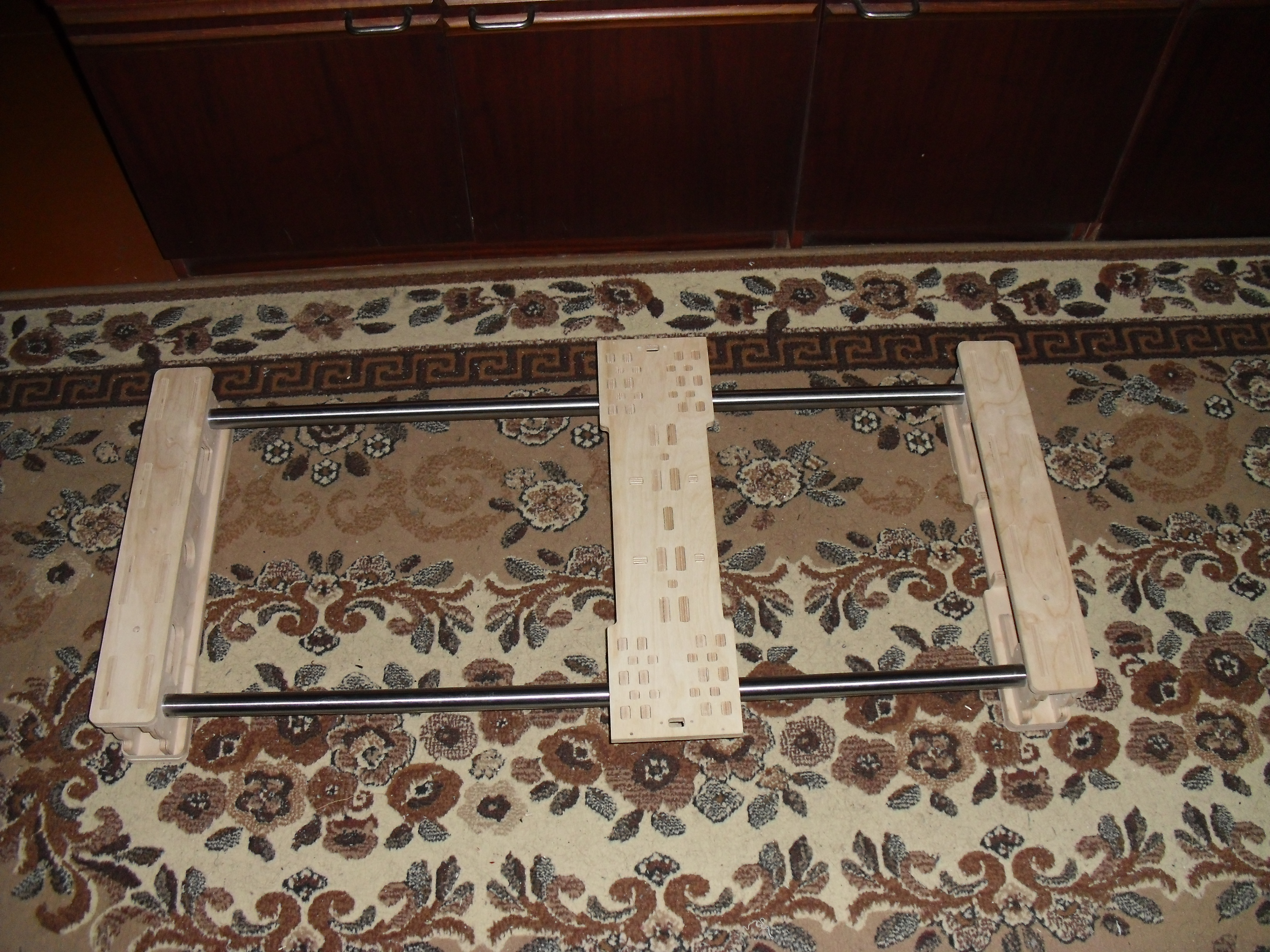 После нескольких таксаний станка туда сюда, быстро понял что это не дело. Стакок хоть и из фанеры но тяжело таскать его тула сюда. В итоге прогулялся к местным мебельщикам и заказал у них по своим размерам тумбочку на колесиках и водрузил на нее станок.