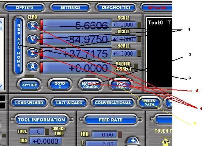 При установке софтлимитов желательно загрузить какую-нибудь УП и нажать Дисплей Моде под окном визуализации и появиться пунктирный квадрат\прямоугольник в окне визуализации, это и есть софт лимит в наглядном виде. И когда вы меняете цифры в вкладке Motor Home\Softlimits вы наглядно видите где встали ваши софтлимиты. Прежде чем устанавливать софлимиты надо установить машинный ноль так как лимиты считаются от машинного ноля.
