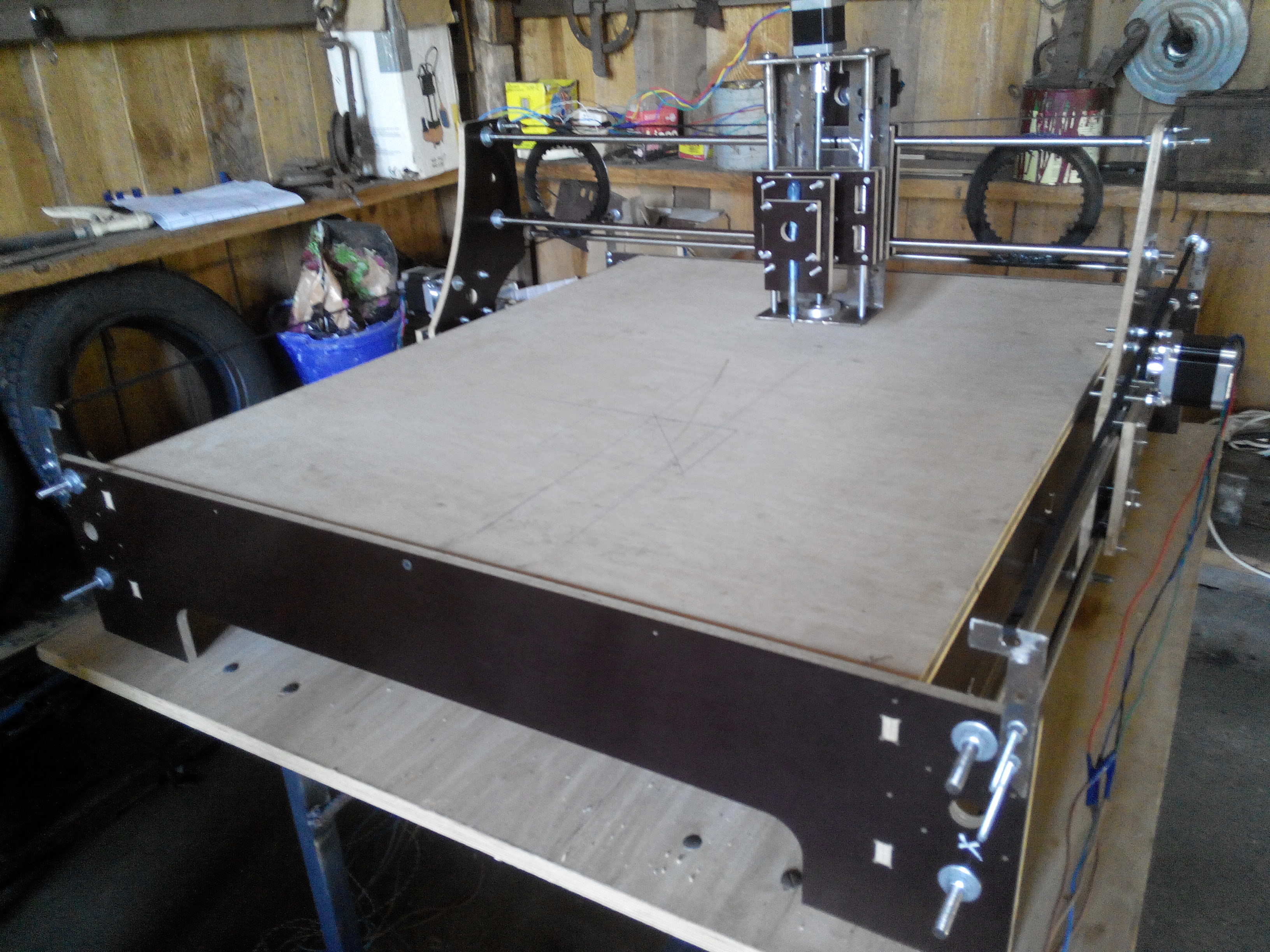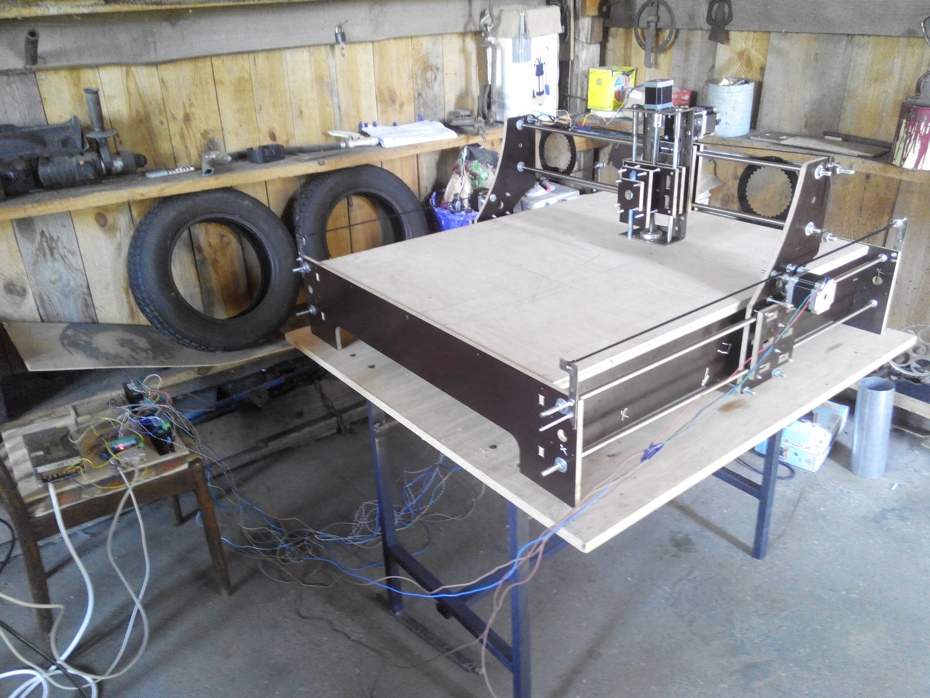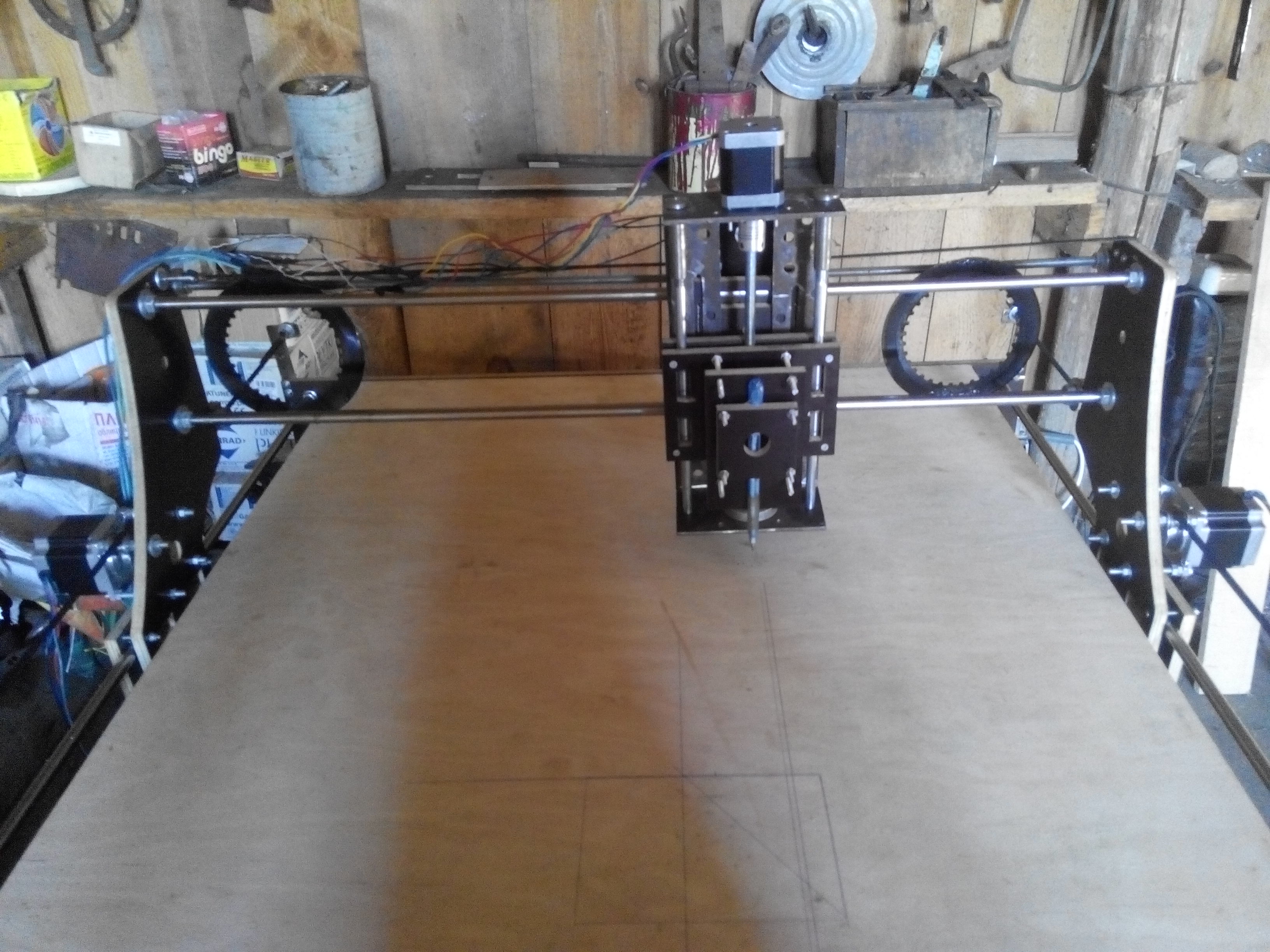 Окружность попробуй нарисовать, мне кажется получится овал, возможно из-за ускорений прогибается конструкция, жесткости действительно мало, я б ещё панель на портале по заду поставил(ну это так лирика) валы я так понимаю 16мм, ну и ремни на выдвинутых пластинах не айс.