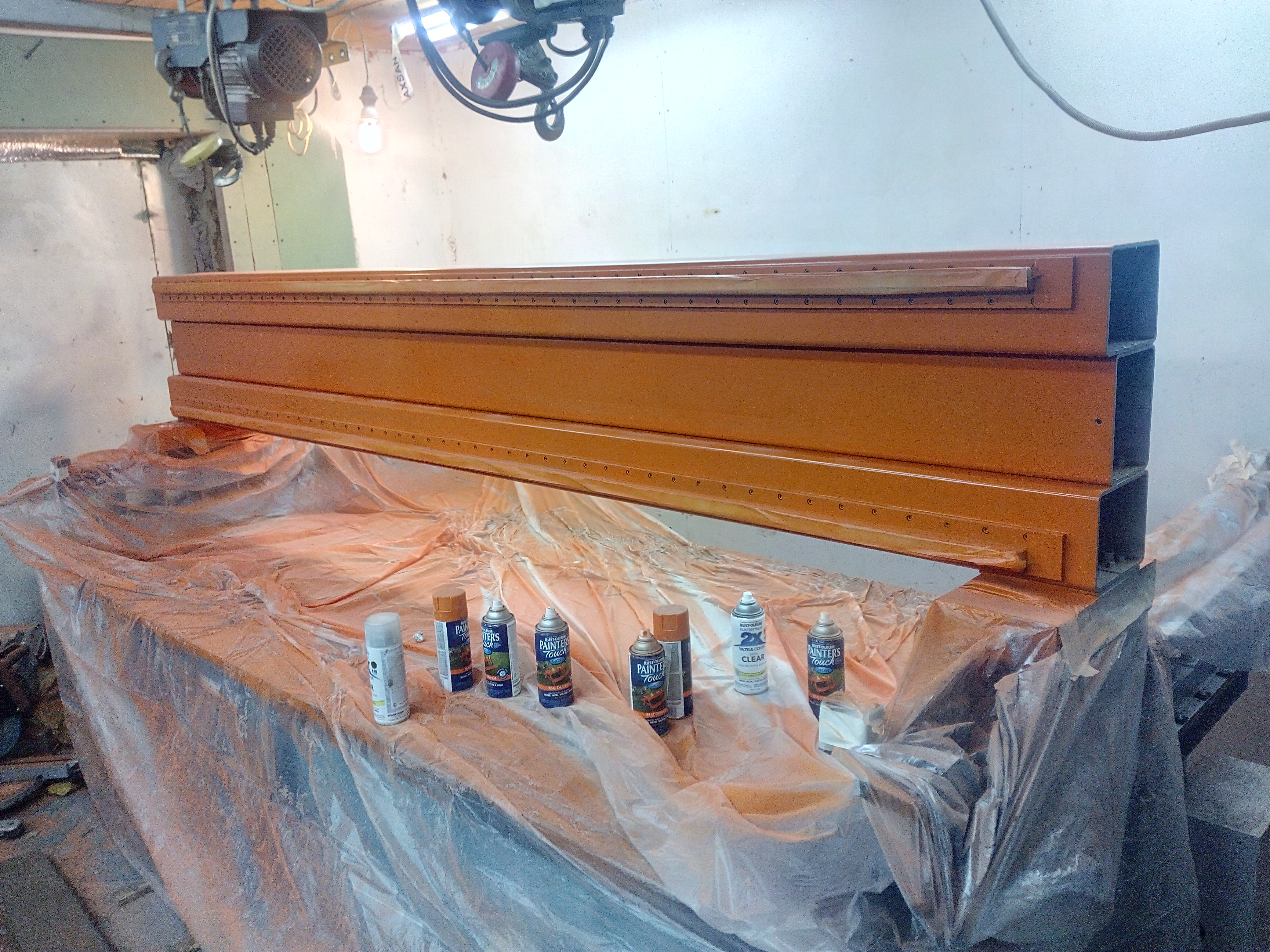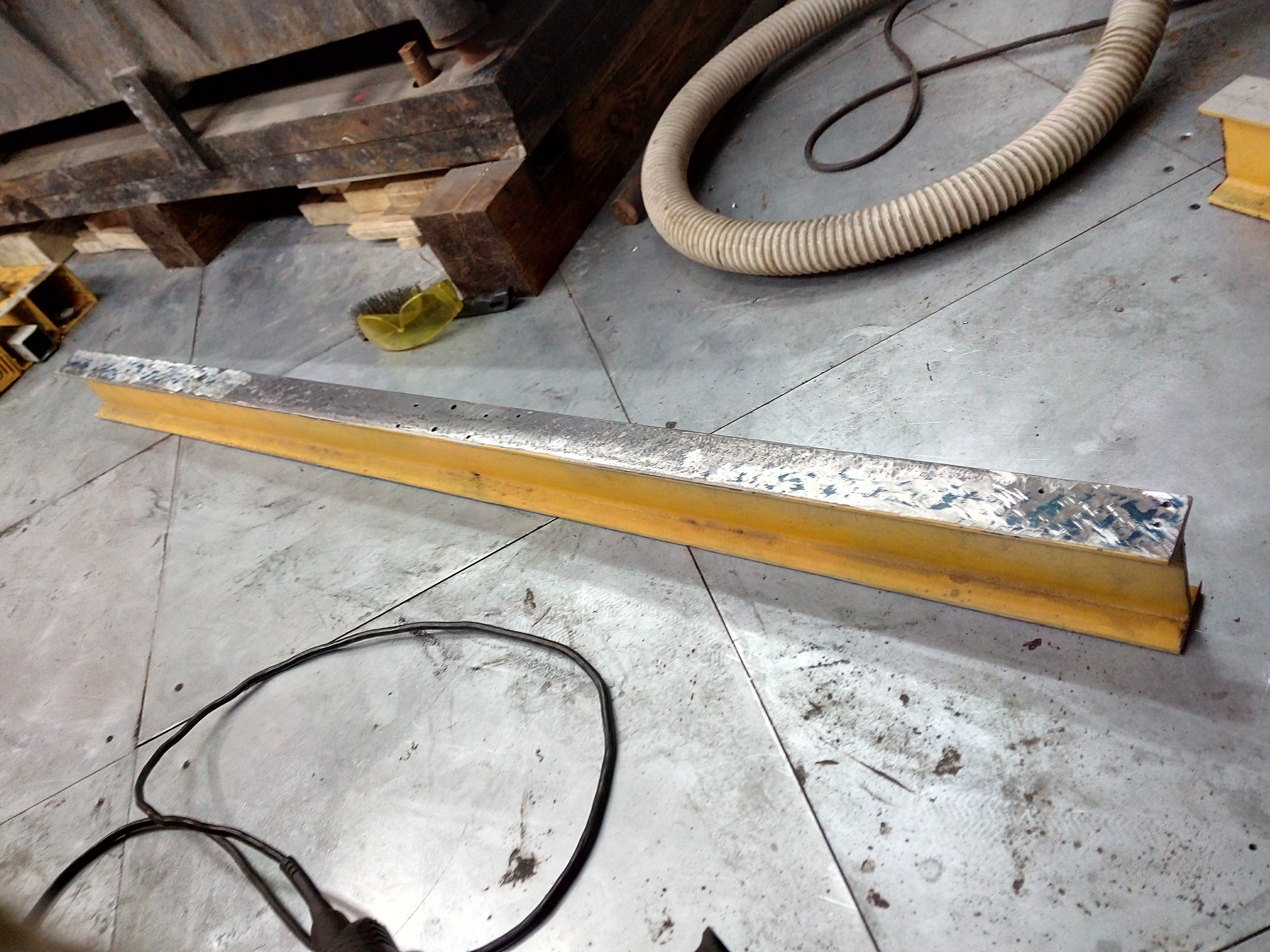 Далее последовало несколько недель проектирования и затем изготовления опор под рельсы. В виду печального финансового состояния пришлось пользоваться тем что нашлось в мастерской. Опоры решил изготовить из двутавровой балки №10 - два параллельных отрезка перекрываются несколькими перемычками, который сверху накрылись 50м квадратом и полосой 10х100. На чертеже все выглядело красиво и просто, но процесс сборки затянулся на долгие недели. В это время я не расставался с болгаркой и масляной краской, затем к этому набору прибавилась наждачная бумага, пневмоцилиндр и измерительная стойка. Все детали в черновую выводились болгаркой на краску, затем все дотиралось на наждачной бумаге уложенной на плите.