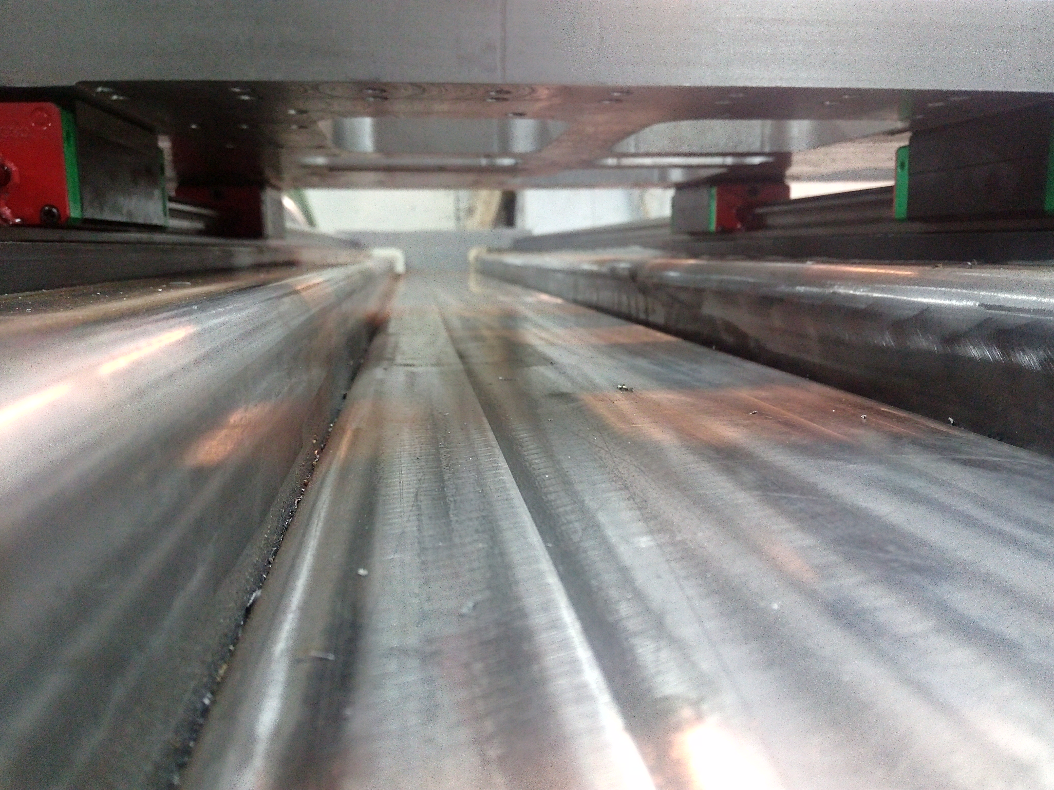Каретку оси X (на которой будут установлены две оси Z) обработать было не легко. Деталь имеет размеры 900х480х32 (а заготовка была 950х520х36) - пришлось обрабатывать самостоятельно на станке 6В75 размер рабочего поля которого значительно меньше этой детали (250х150мм). Многие могли бы сказать что это не возможно, но результат на фото: