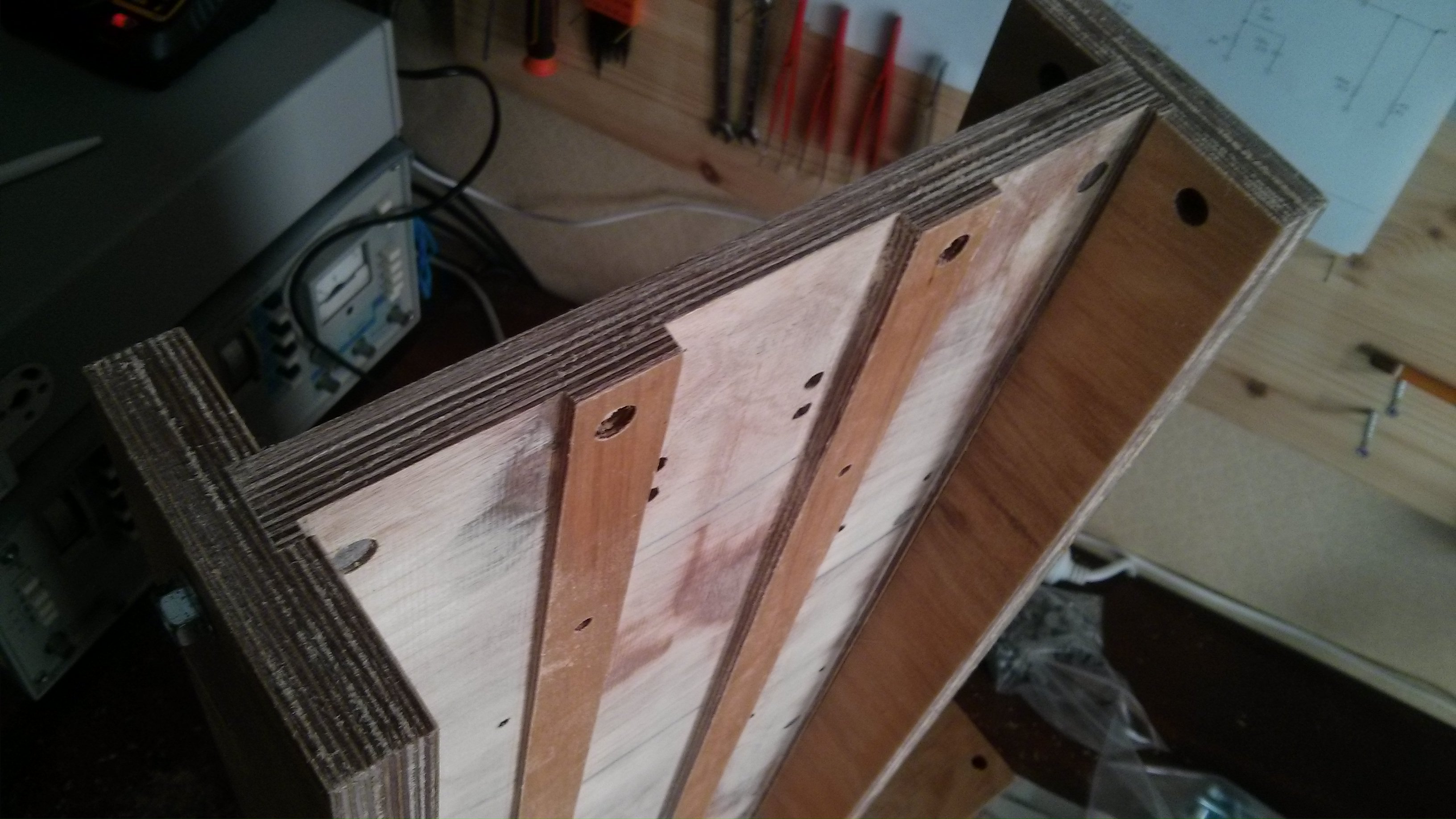 Основное отличие конструкции от первоначального замысла, что в фанере были вырезаны пазы и в них в стык соединена фанера через мебельные стяжки, заодно эти пазы послужили базой и не пришлось ничего выравнивать при сборке, когда все стянул стяжками все встало само.