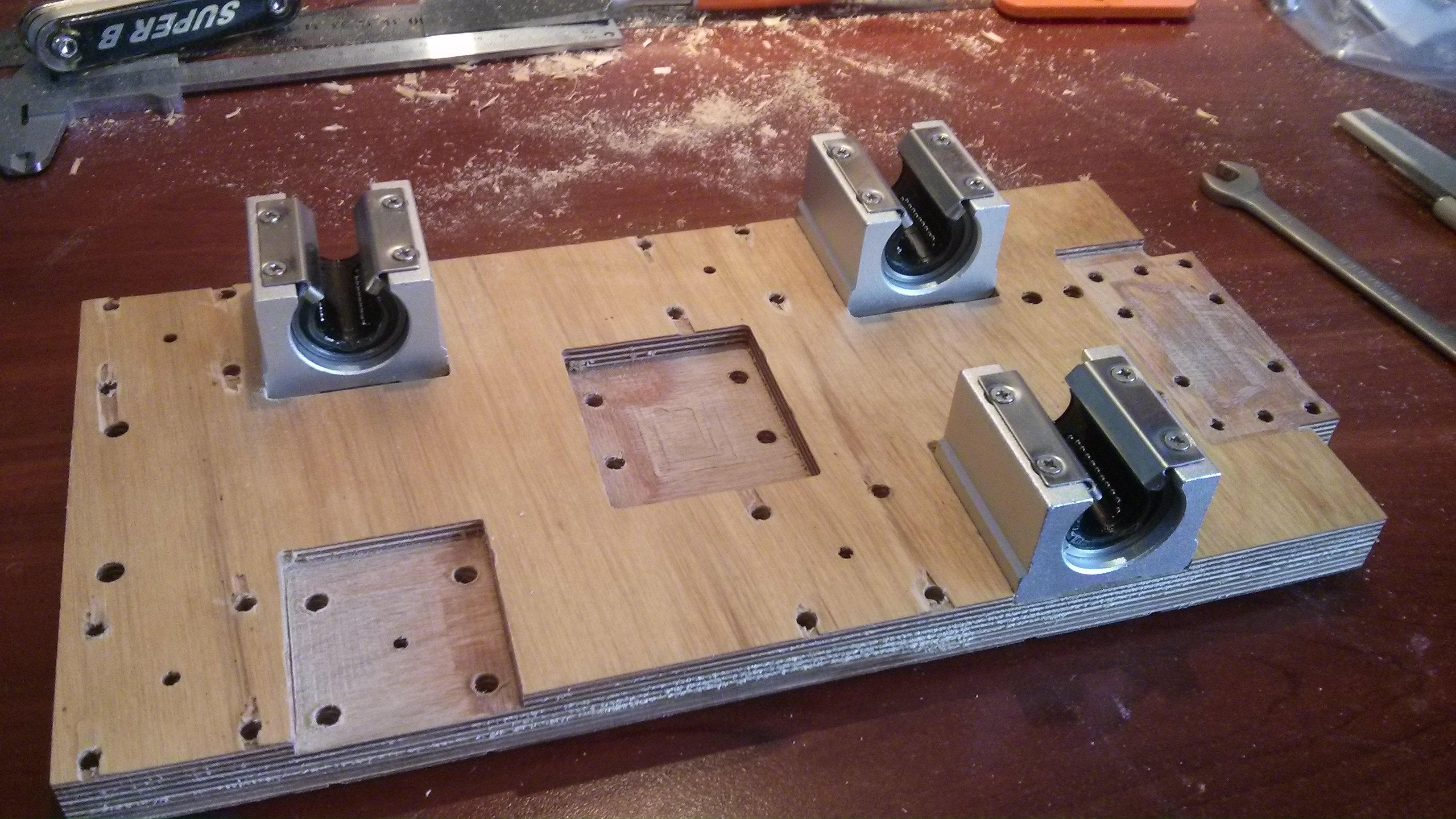 Заодно были фрезерованы базы под профильные рельсы, линейные подшипники и тд, под все что крепится к фанере. Заказывал фрезеровку на ЧПУ.