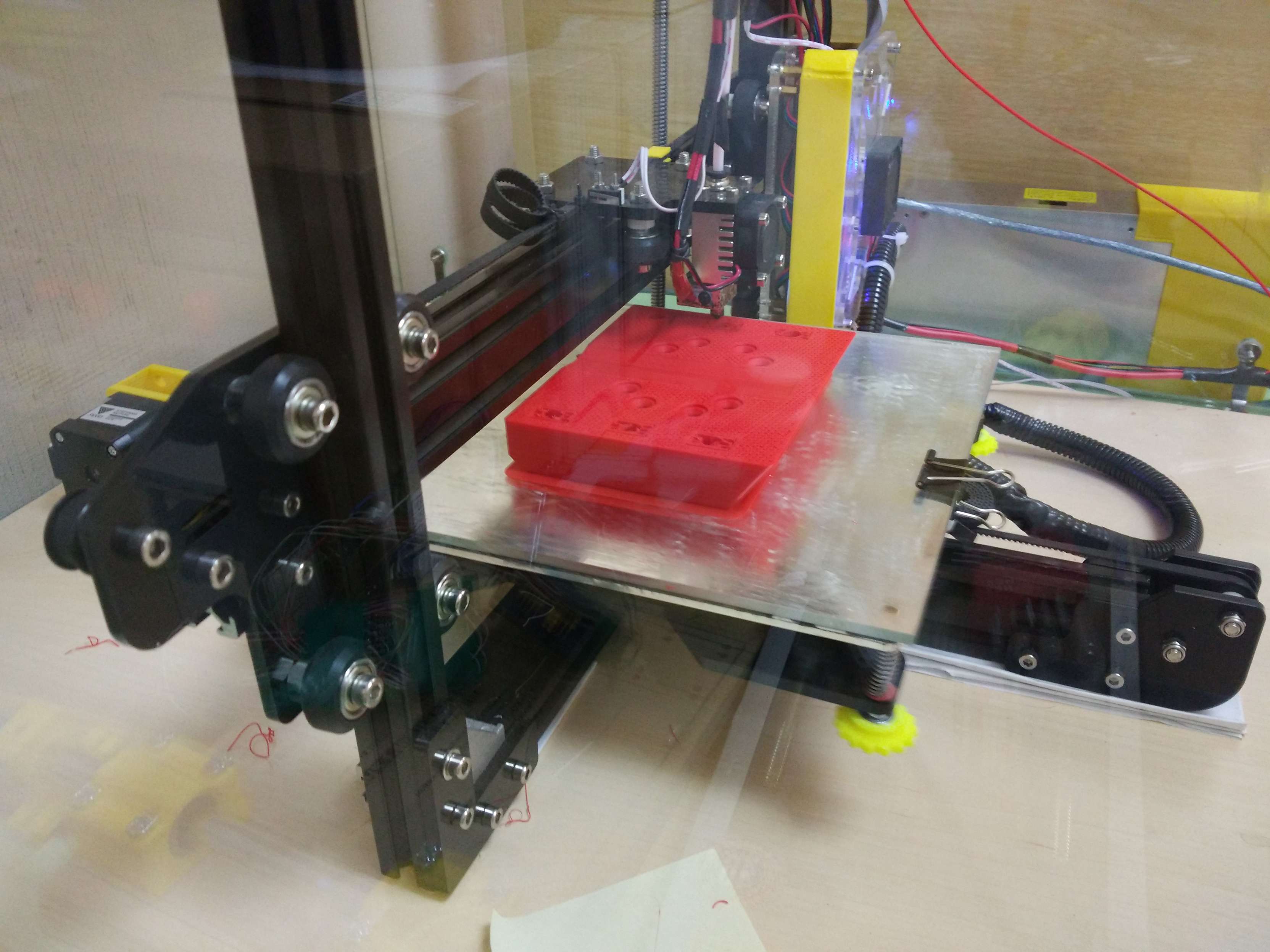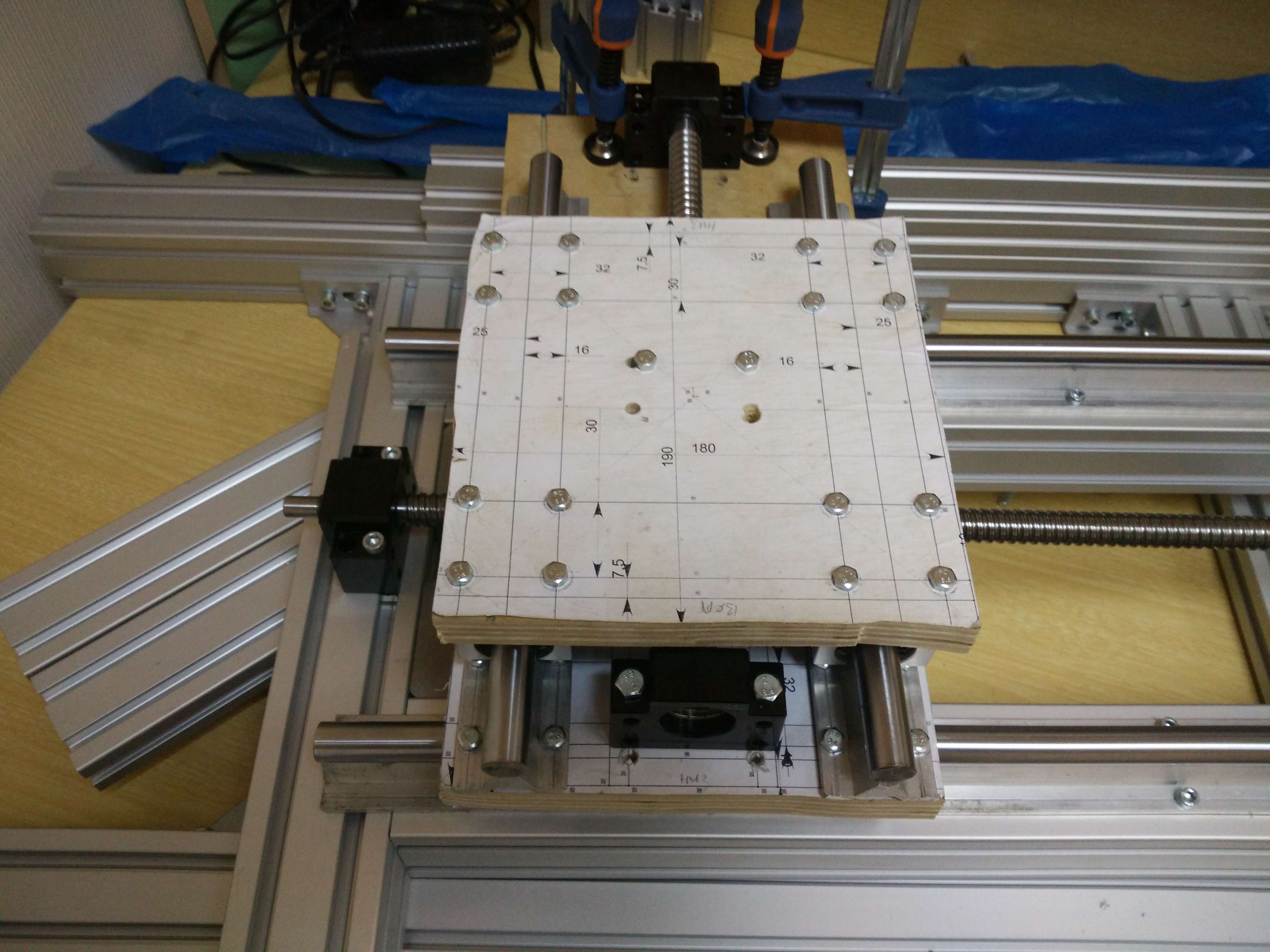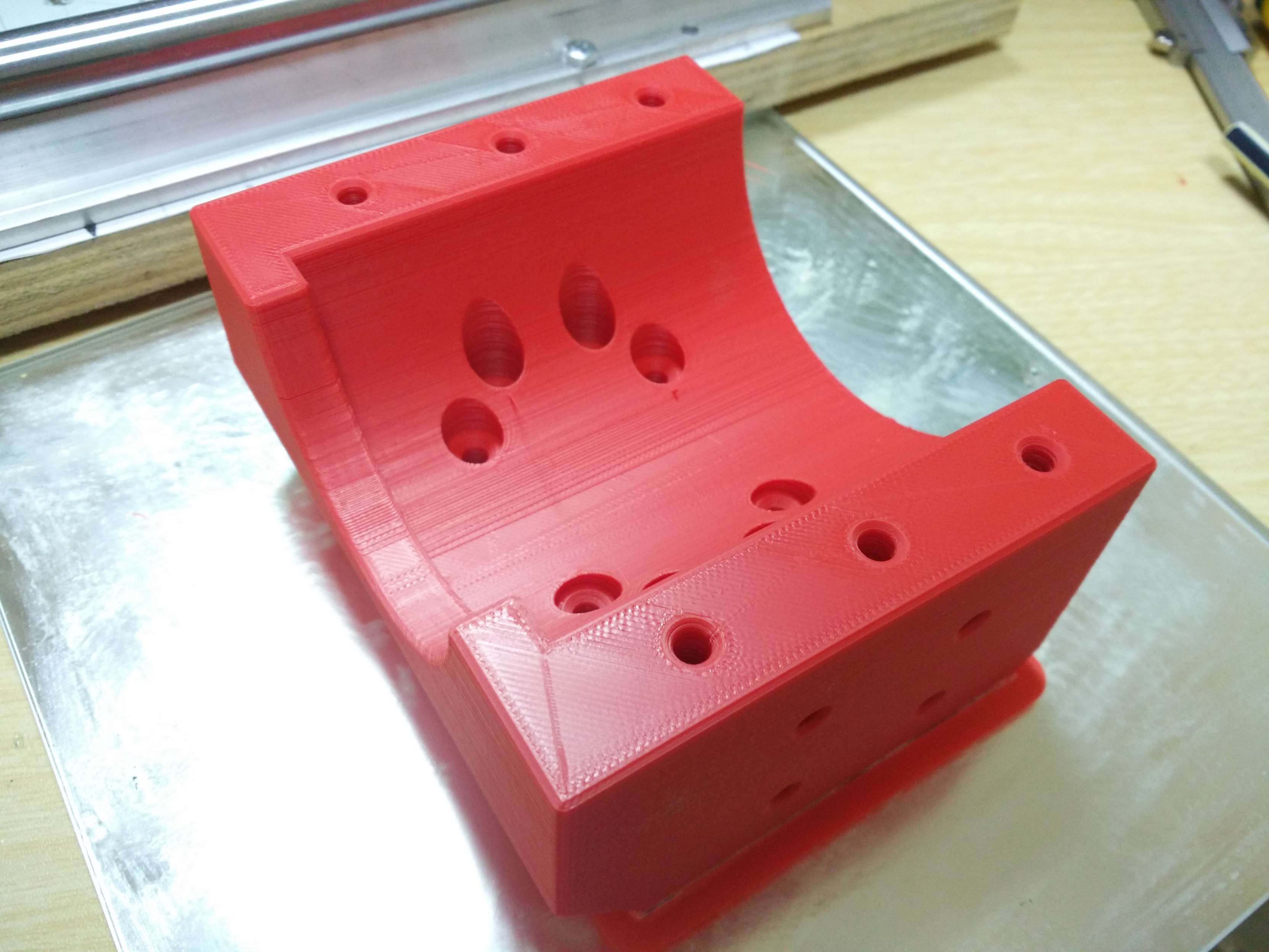 Сделал разметку под фланец, или как правильно назвать крепление, гайки ШВП Купил сверлилку. По сравнению с шуроповертом это как полет в космос. Биения конечно дикие, но намного лучше чем вручную. Бюджет совсем запел. Временно крепления печатаю, в надежде что их хватит хотя бы выпилить крепление из фанеры а дальше уже на алюминий посмотрим. Выглядит кстати не плохо, монументально, насколько это возможно в рамках пластика. печатал почти двое суток одну часть. Почти 0,5 кило пластика. Далее начинаю пытаться выставить соосно винт ШВП. Если честно то думал это будет легче. Но.... ошибки, переделки ... зато опыт