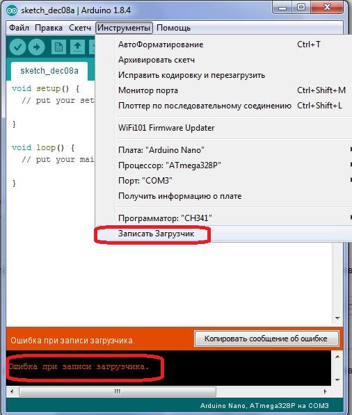 При попытке записи загрузчика, тоже ошибка. Может плату выбрал не ту?