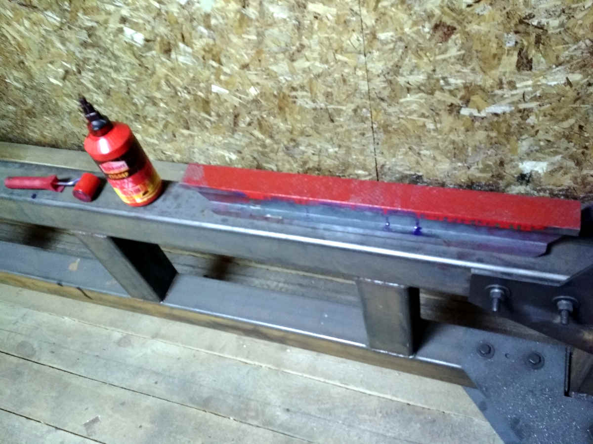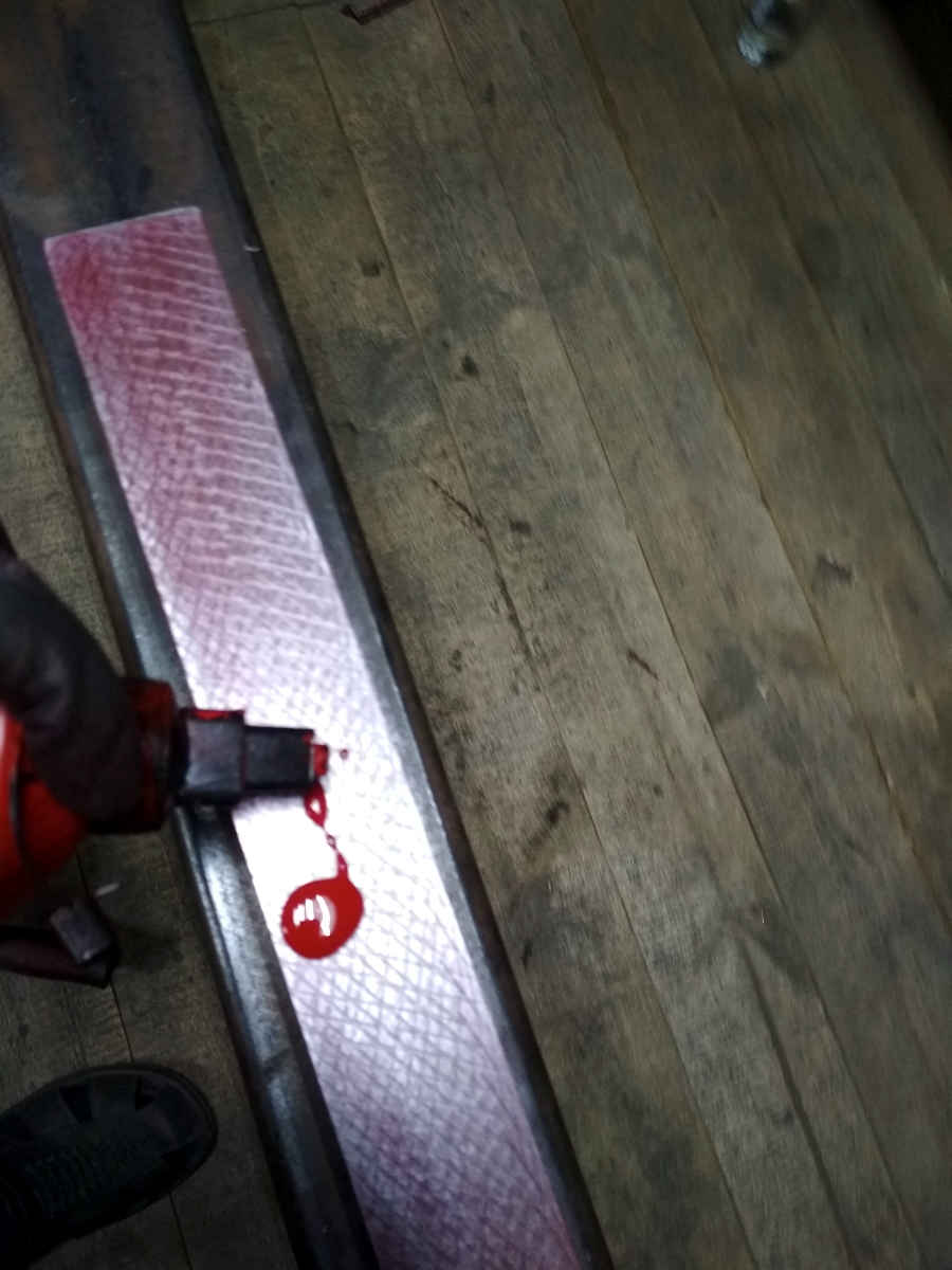 Далее выставляем горизонталь с помощью рамного уровня, линейки ШМ630, краски и той же УШМ с фибровым диском Краску, кстати, удобно держать в емкости из-под клея с носиком. Экономно, чисто. Метод известный - наносим линейкой краску на поверхность, места соприкосновения шлифуем: В данном случае приходилось периодически устанавливать рамный уровень.