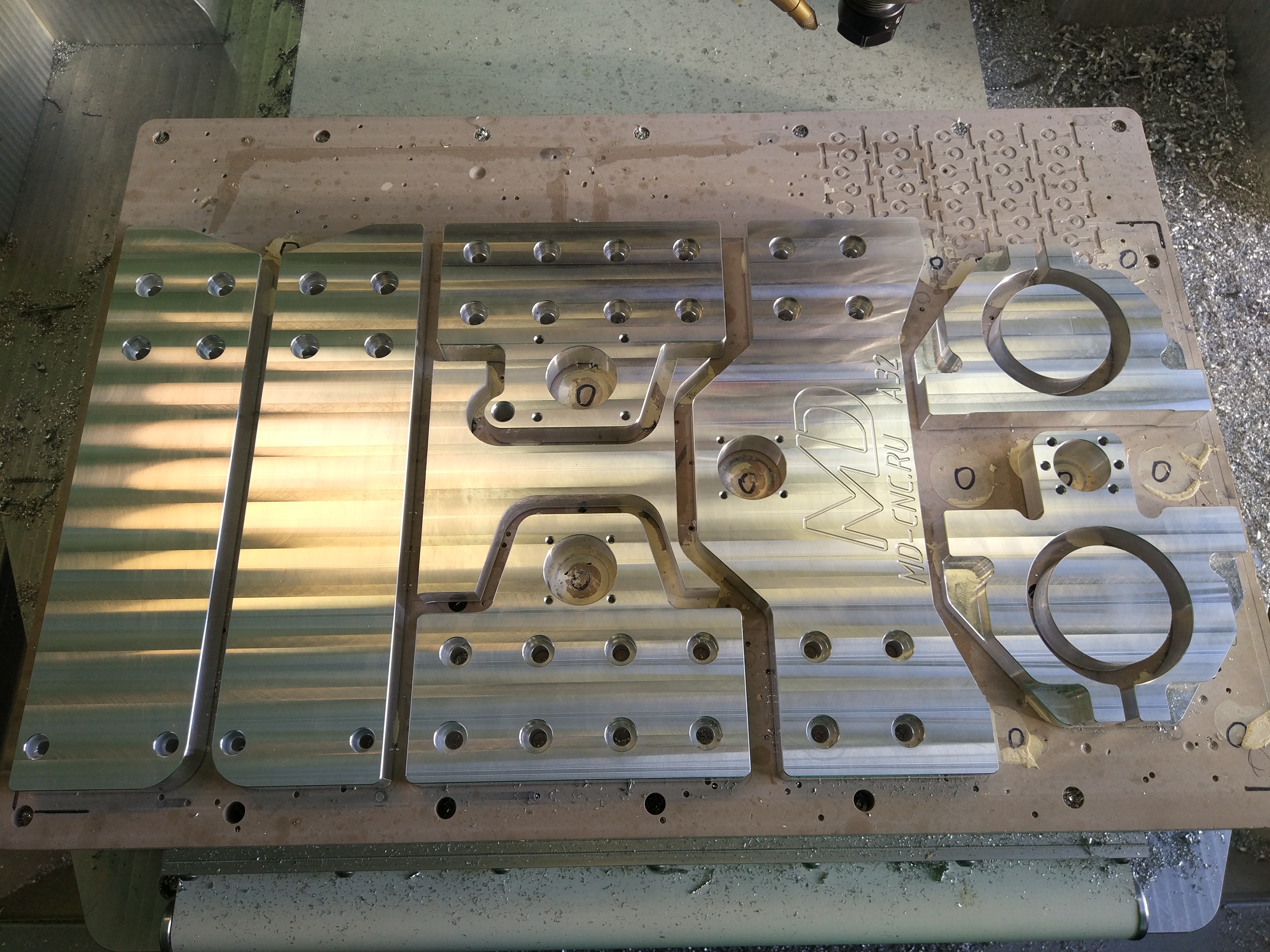 Пыление плоскости можно делать первым шагом, переставляя прижимы, или через отверстия в припусках, или в местах где ходит фреза по контуру, после чего переворачивать заготовку.