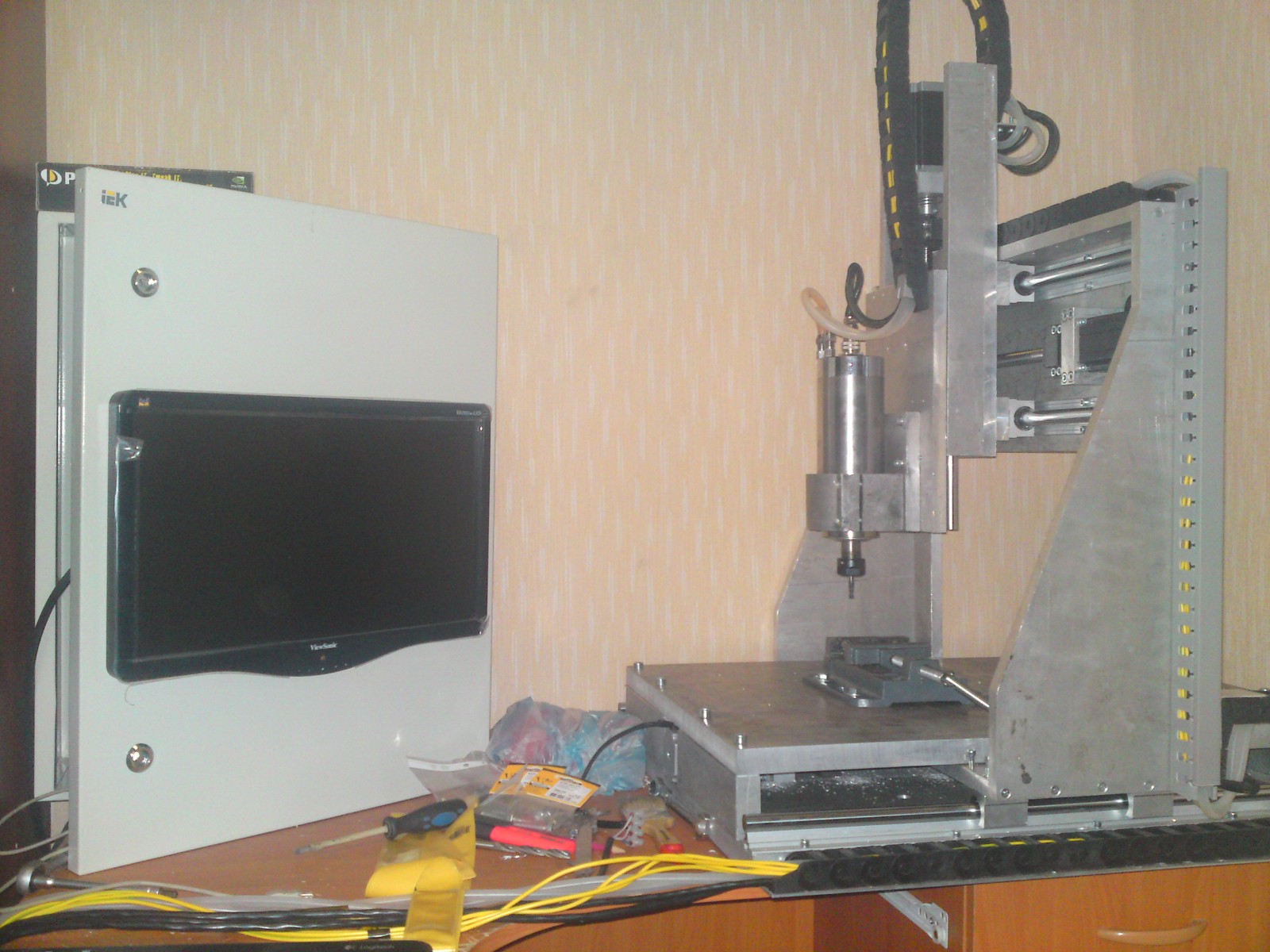 Рабочее поле 340х400х150, шпиндель 2.2 кВт, валы, подшипники и ШВП от Мэри, цветмет местный. После тщательного чтения страниц форума (огромное спасибо все писавшим и пережившим на себе муки творчества), мануалов на EMC2 (Nick - респект!) все поехало, шпиндель закрутился, тестовые УП отработались. Жужжание шаговиков - музыка!
