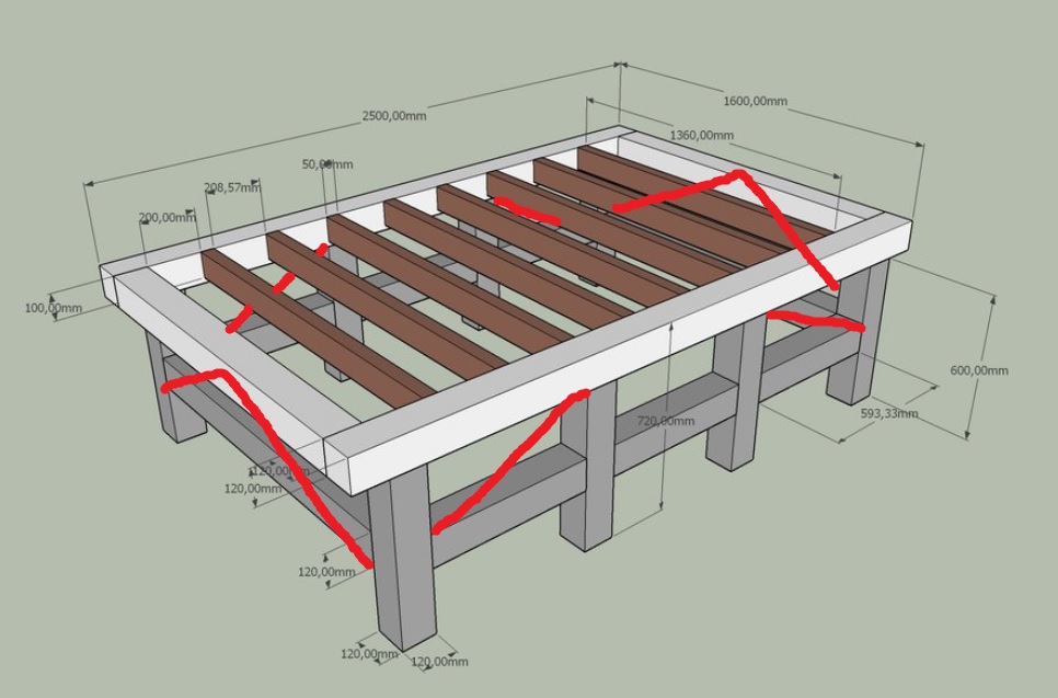 Вы нарисовали висячий стол. Можете воспользоваться поиском на форуме по этой паре слов, чтоб более детально вникнуть в то, что такое укосины, распорки и обвязка.