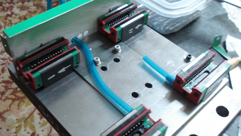 Так же как и ось Y в процессе сборки претерпела кучу модернизаций и переделок. Изначально я сделал ее из стали 10мм Затем решил подойти глобально и передлать все на деталь из цельного куска стали. Каретки и направляющие - Hiwin HG15. ШВП - Kuroda C5 1505 с блоками от SYK из Тайваня. Качество блоков очень высокое. Винт прижима к резьбе ШВП из бронзы. На каждом блоке стоят метки, указывающие направления при монтаже. Одним словом - класс. Т.к. ШВП и рельсы стоят денег сразу решил заморочиться со смазкой оных. Сделал смазку на пневмофитингах и бензо- маслостойких шлангах. Решил смазывать жидким маслом потому что густое нет возможности толкать - сорвет шланги с тавотниц. Но оказалось что гайка ШВП имеет кучу зазоров и масло вытекало отовсюду откуда можно. По совету форумчан смазку переделал на обдув воздухом с каплей масла. По идее воздух должен выдувать пыль и одновременно смазывать. Сказано - сделано. Куплена маслостанция Camozzi, таймер у китайцев и теперь каждые полчаса идет включение на 0,7с с давлением около 1Бар. Т.к. воздух мы уже подвели, то неплохо бы и компенсировать вес оси пневмоцилиндром. Тут целая история получилась.