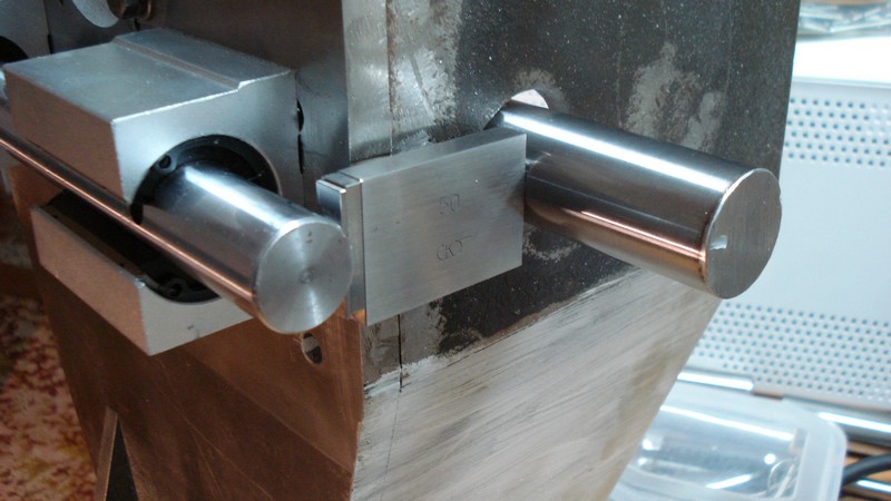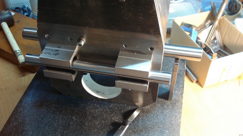 Теперь надо запараллелить оси вращения скалки и направляющей вверх/вниз. Тут все просто. Выставляем ногу подкладками из щупов на плите чтобы ось направляющей была параллельна плоскости плиты с помощью КМД: Ну, а потом скалку запараллелить плите с помощью тех же КМД - дело 5 мин. Зажимаю винтами крепление и сверлю 2отв. под штифты. И всё, бинго! Теперь сколько не разбирай/собирай, ось вращения подшипников всегда параллельна оси направляющей, а ось подшипников соосна с осью вращения гайки.