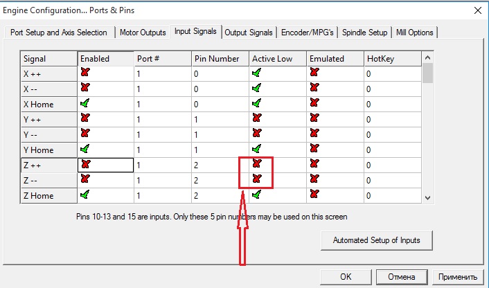 Это входы от концевых выключателей. Поставишь галочки — перестанут работать, если до этого работали.new_design писал(а):правильно ли будет поставить две галочки на z++, z-- как на скриншоте? http://www.cnc-club.ru/forum/download/f ... &mode=view