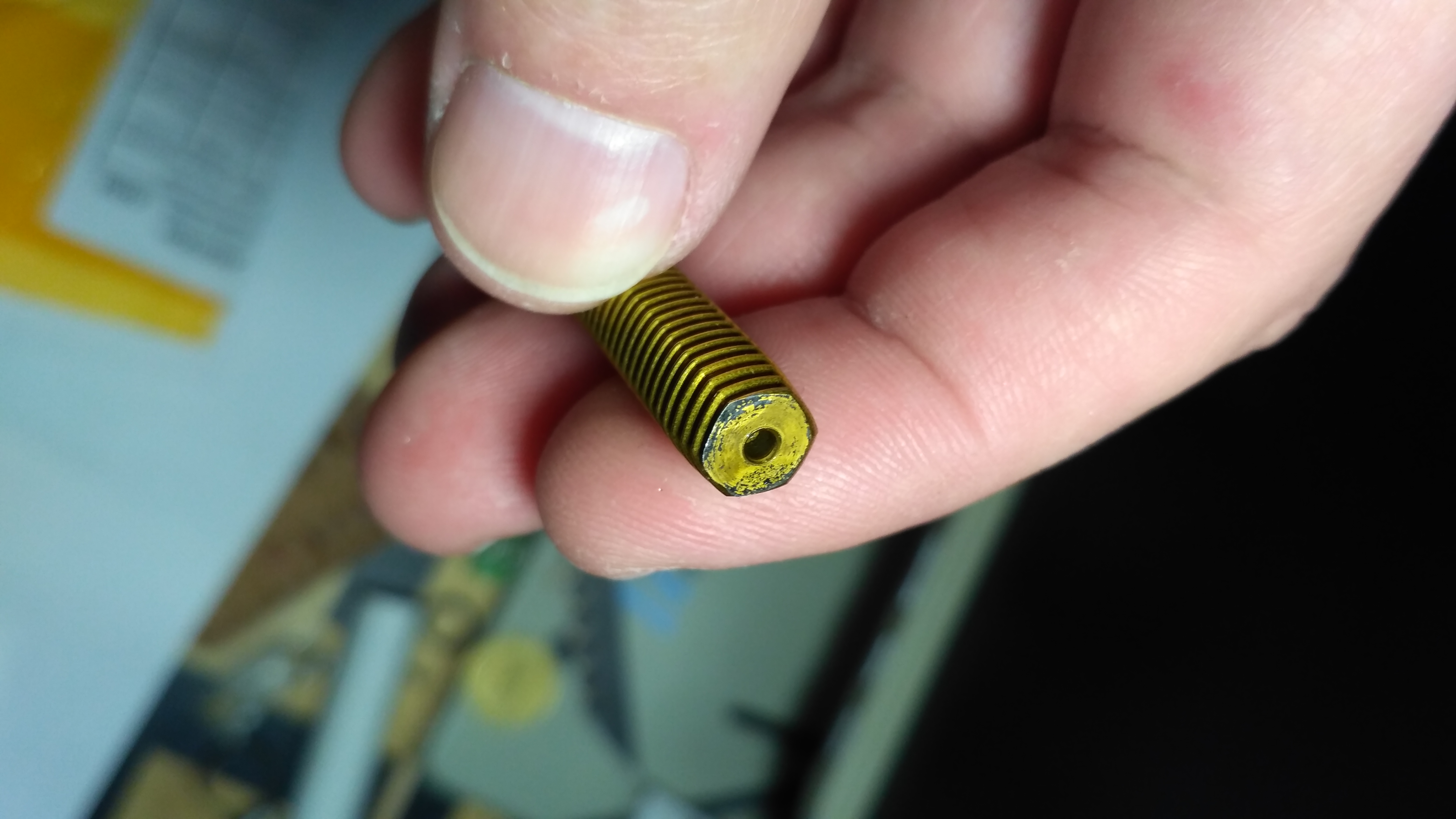 Метчик брал у Алика - самый дешевый. Не могу сильно похвалить качество, но с задачей он справился неплохо. Резьба получилась с полной высотой, не смотря на разбивку на сектора - внутренний диаметр около 6,7мм. Похоже у моего метчика какой-то косяк на последнем витке иначе резьба была-бы еще плотнее.